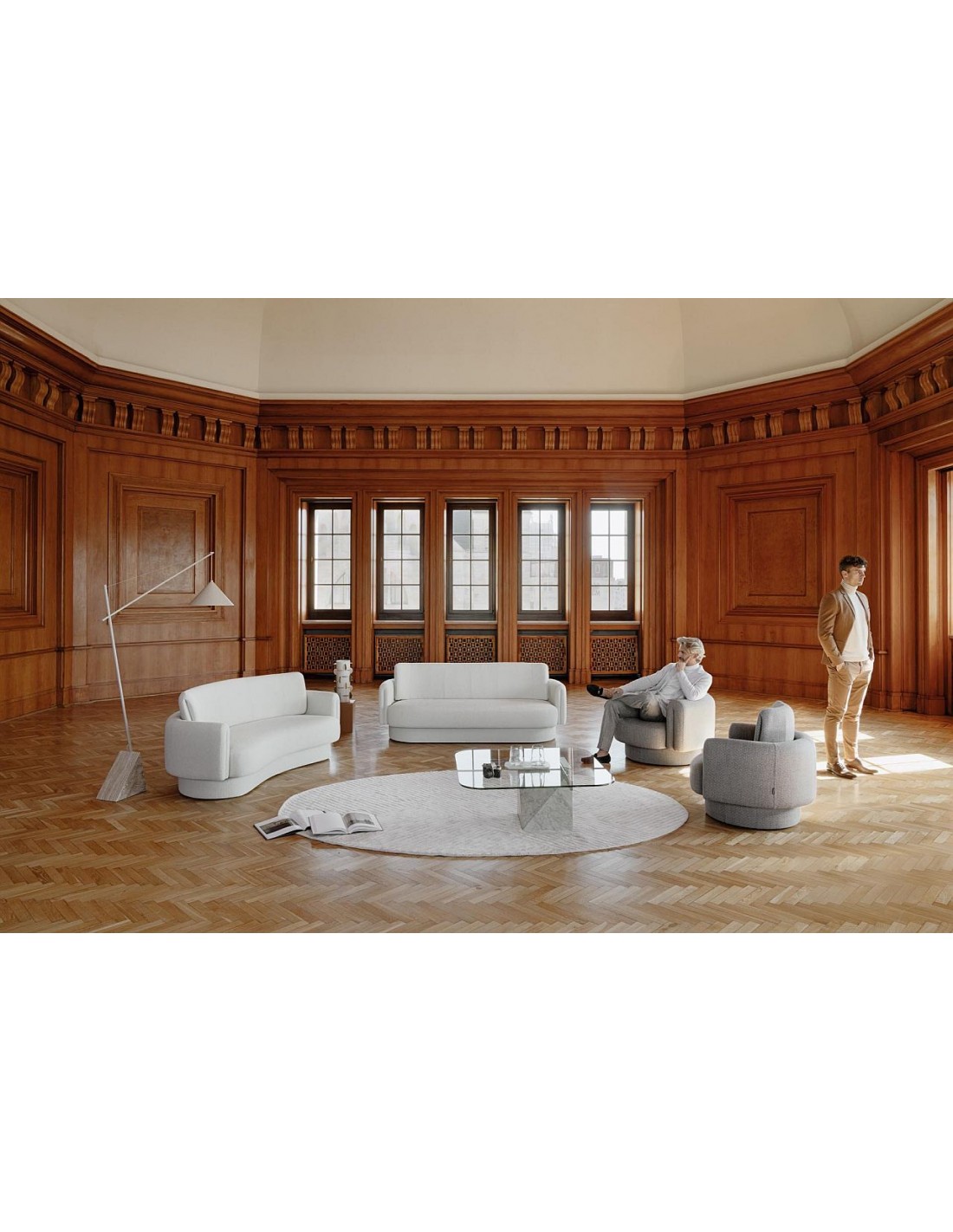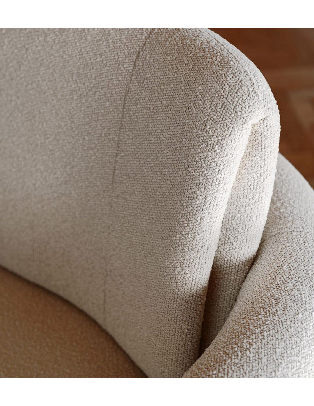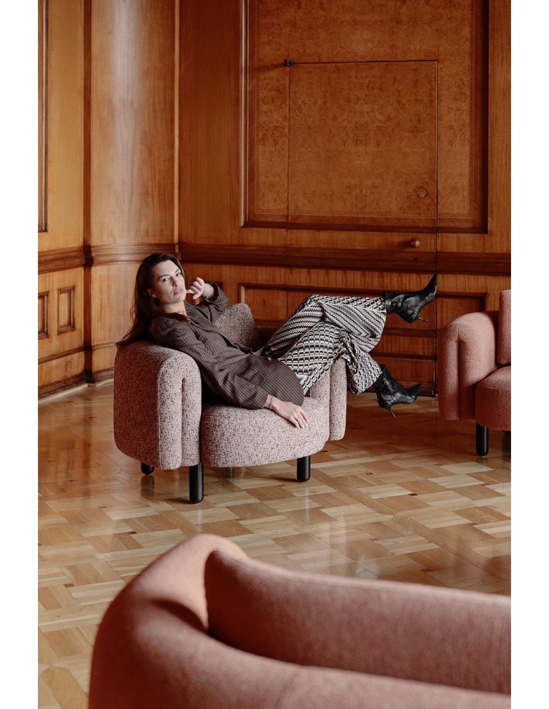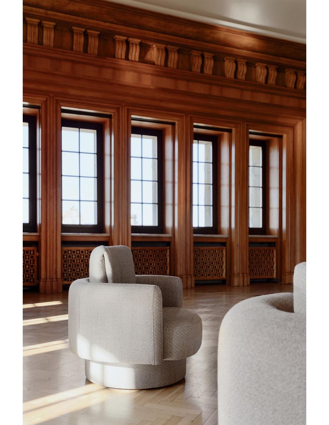 Stilīgs krēsls BOFI ar noapaļotu siluetu un teksturētu pelēku audumu, kas balstās uz koka pamata. Ideāli piemērots mūsdienu interjeriem, piedāvājot komfortu un eleganci viesistabām vai radošām studijām.