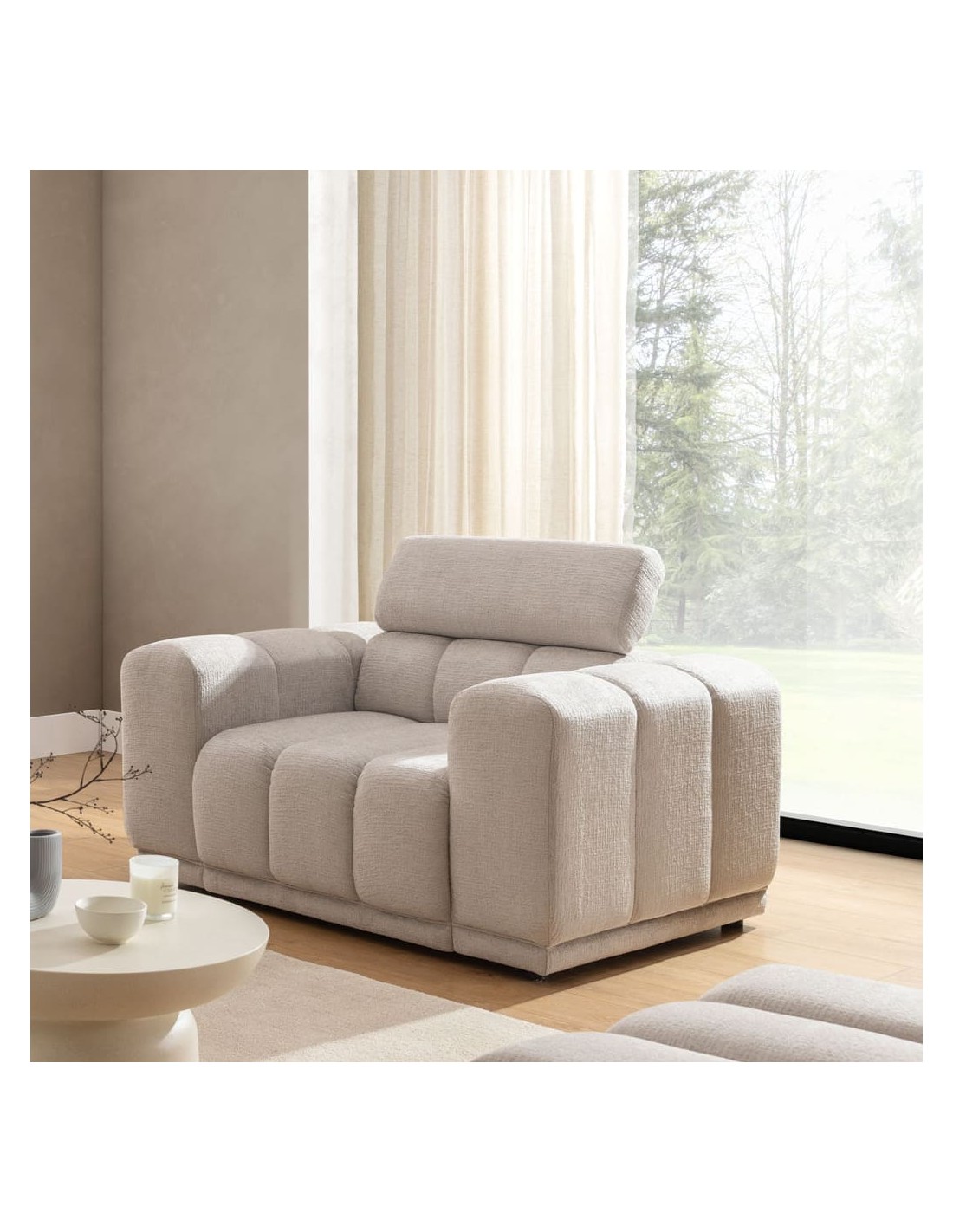 GUSTO moderns atpūtas krēsls ar regulējamu galvas balstu - ērts un pielāgojams risinājums viesistabai. Funkcionāls dizains.