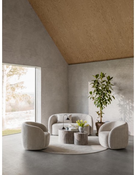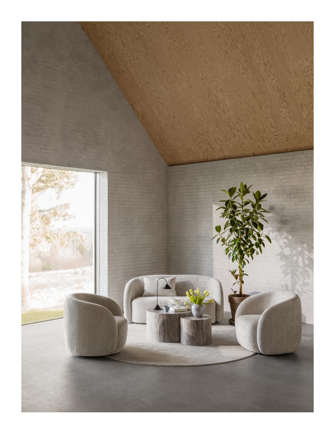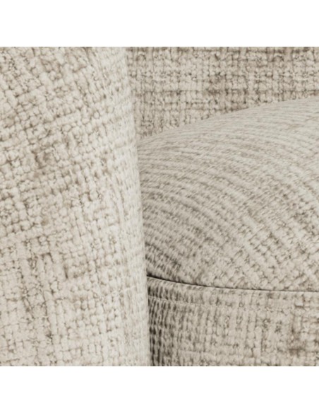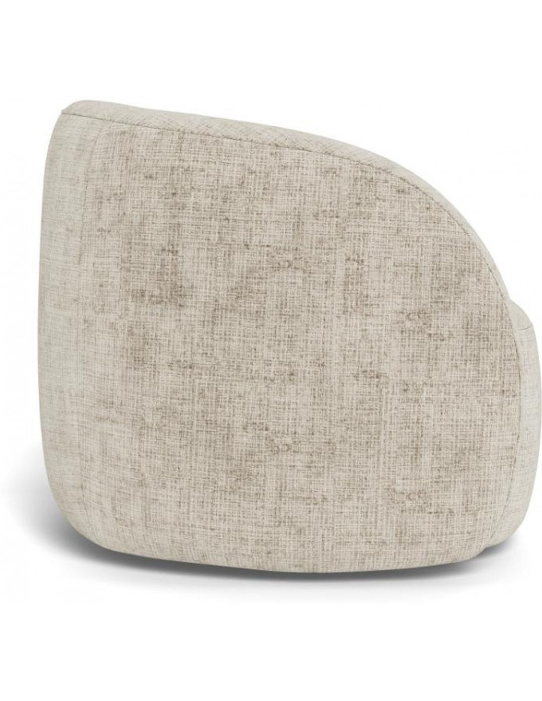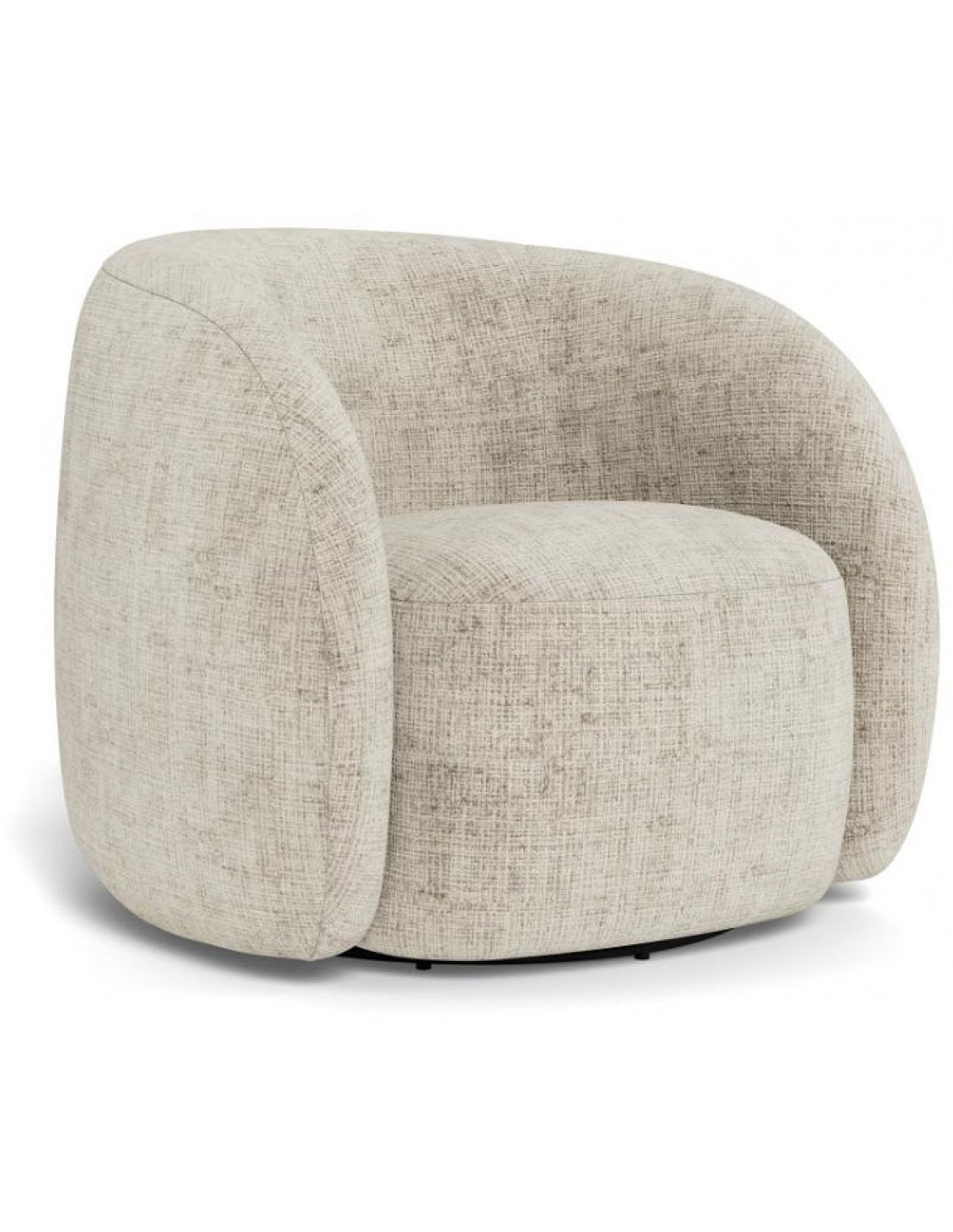 Šis atpūtas krēsls izceļas ar organiskām, maigi izliektām formām, kas apņem sēdošo un sniedz izcilu komforta sajūtu. Bēškrāsas teksturētais audums rada mājīgu un siltu atmosfēru, un modernais dizains viegli iederas dažādos interjeros.