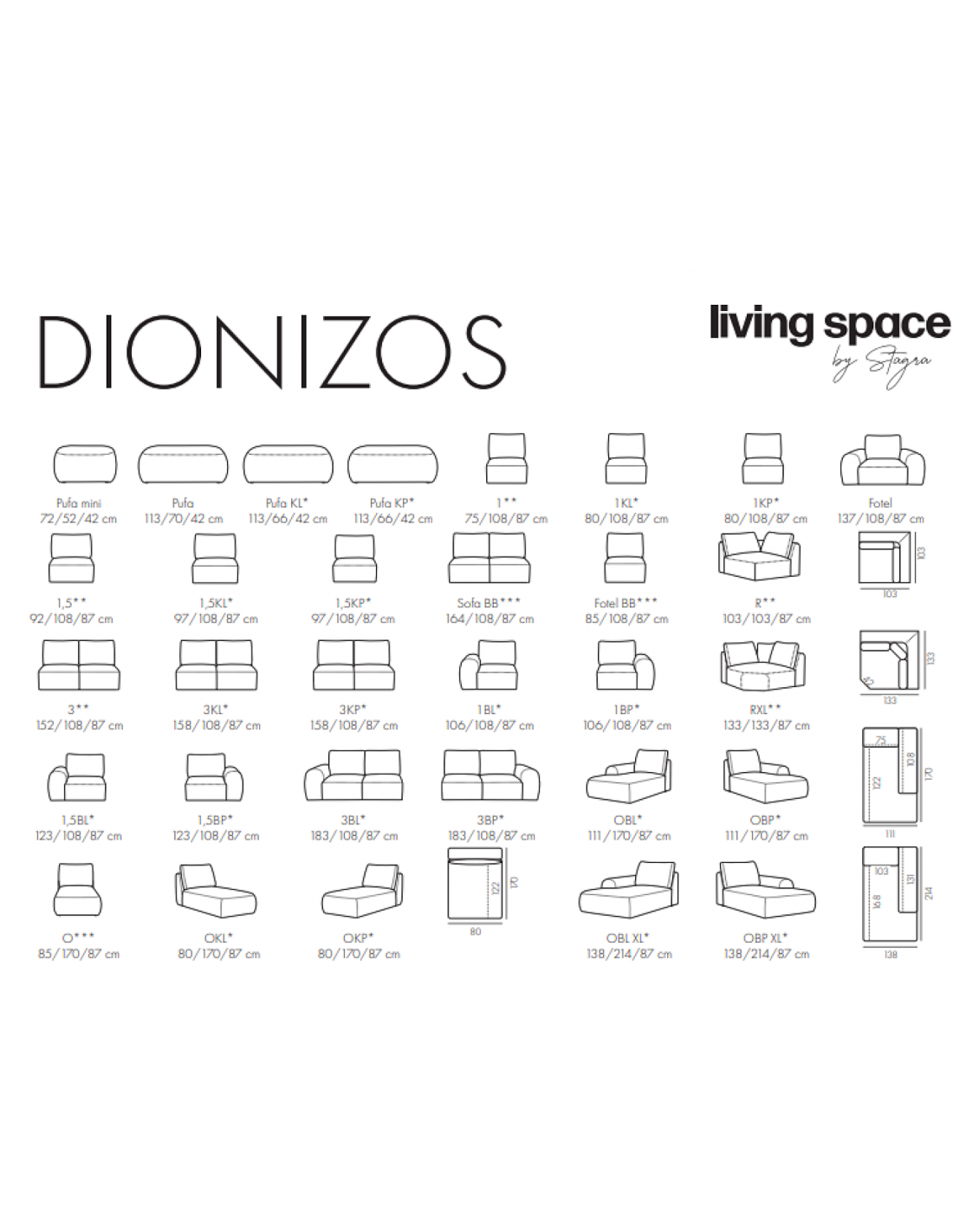 DIONISS ir elegants modulārais dīvāns, kas apvieno modernu estētiku ar maksimālu komfortu. Tā mīkstais polsterējums un ergonomiskā forma nodrošina patīkamu atpūtu gan ikdienā, gan viesu uzņemšanā. Modulārā konstrukcija ļauj pielāgot dīvāna izkārtojumu dažādām telpām un vajadzībām, radot individuālu risinājumu. Kvalitatīvie materiāli un izturīgā uzbūve garantē ilgmūžību. Dīvāna dizains lieliski iederas gan modernā, gan klasiskā interjerā, piešķirot telpai eleganci un mājīgumu.