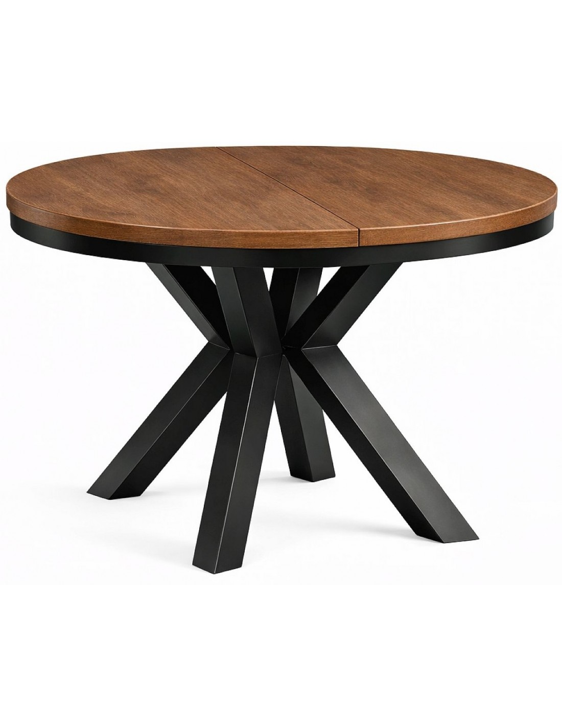 Apaļš izvelkamais galds VIGUS ar lamināta galda virsmu un metāla kanti. Kājas izgatavotas no melna, pulverkrāsota metāla.
