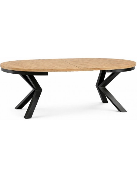 Apaļš izvelkamais galds VIGUS ar lamināta galda virsmu un metāla kanti. Kājas izgatavotas no melna, pulverkrāsota metāla.