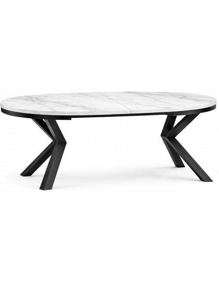 Apaļš izvelkamais galds VIGUS ar lamināta galda virsmu un metāla kanti. Kājas izgatavotas no melna, pulverkrāsota metāla.