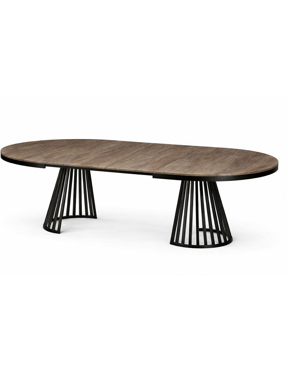 Izvelkams ēdamgalds NORE ar modernu ažūra pamatni un apaļu laminētu galda virsmu. Estētika, funkcionalitāte un elegance vienā.