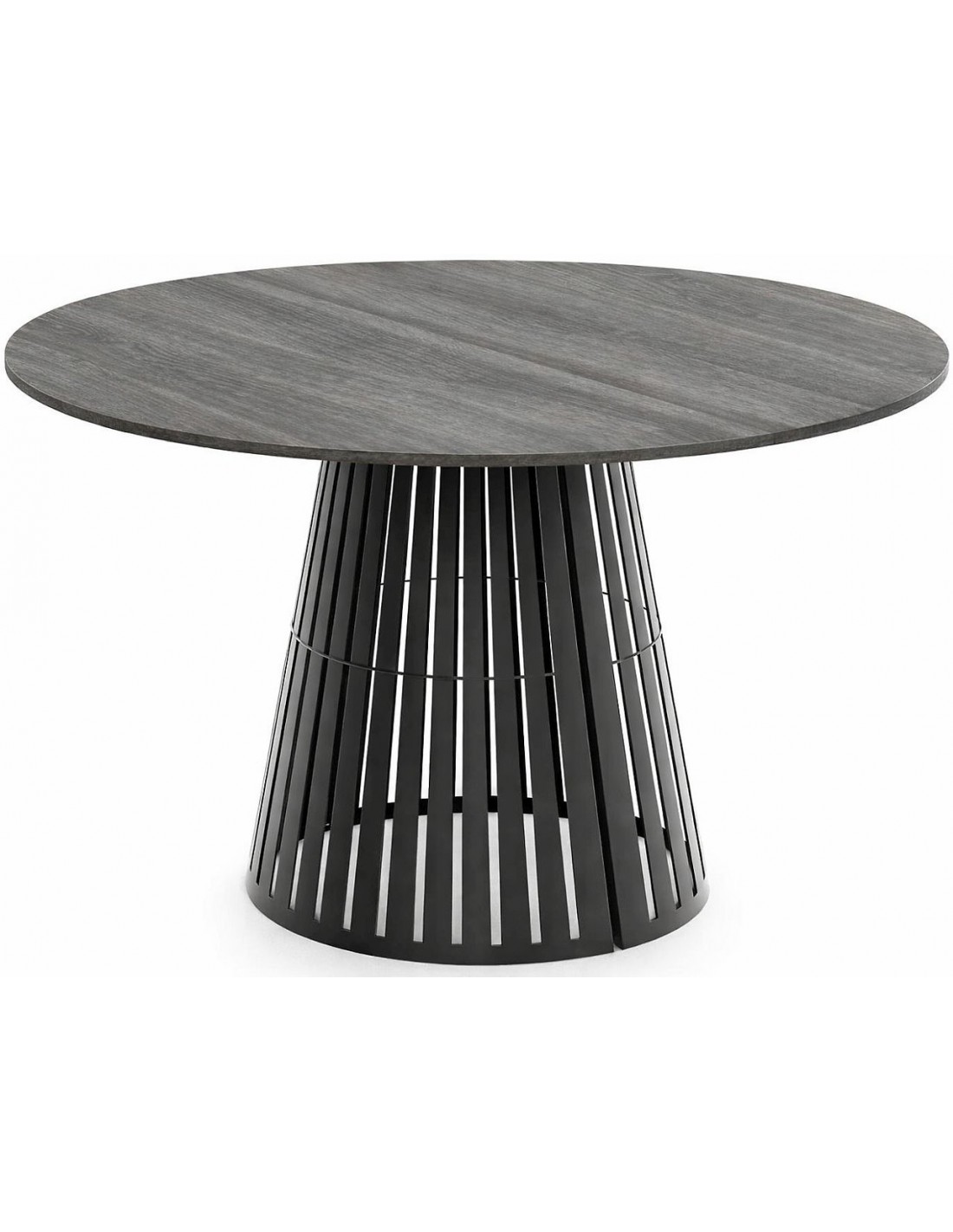 RONE ēdamgalds ir elegances un mūsdienīga dizaina apvienojums, kas lieliski iederēsies gan mājas interjerā, gan komerciālās telpās. Apaļā galda virsma, kas, pateicoties diviem papildu 38 cm ieliktņiem, pagarinās par 76 cm. Tā ļauj ērti uzņemt vairāk viesu. Ažūra konusa formas metāla pamatne, kas pārklāta ar pulverkrāsu, piešķir galdam vieglumu un stabilitāti. Finiera galda virsma ir izturīga pret ikdienas lietošanu un ir 18 mm bieza.