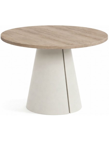 MALMA ir apaļš ēdamgalds, kas apvieno modernu dizainu, dabisku sajūtu un strukturālu stabilitāti. Tā dabīgā lamināta virsma izskatās naturāla, savukārt kontrastējošās konusveida metāla kājas rada neuzkrītošu industriālu akcentu.