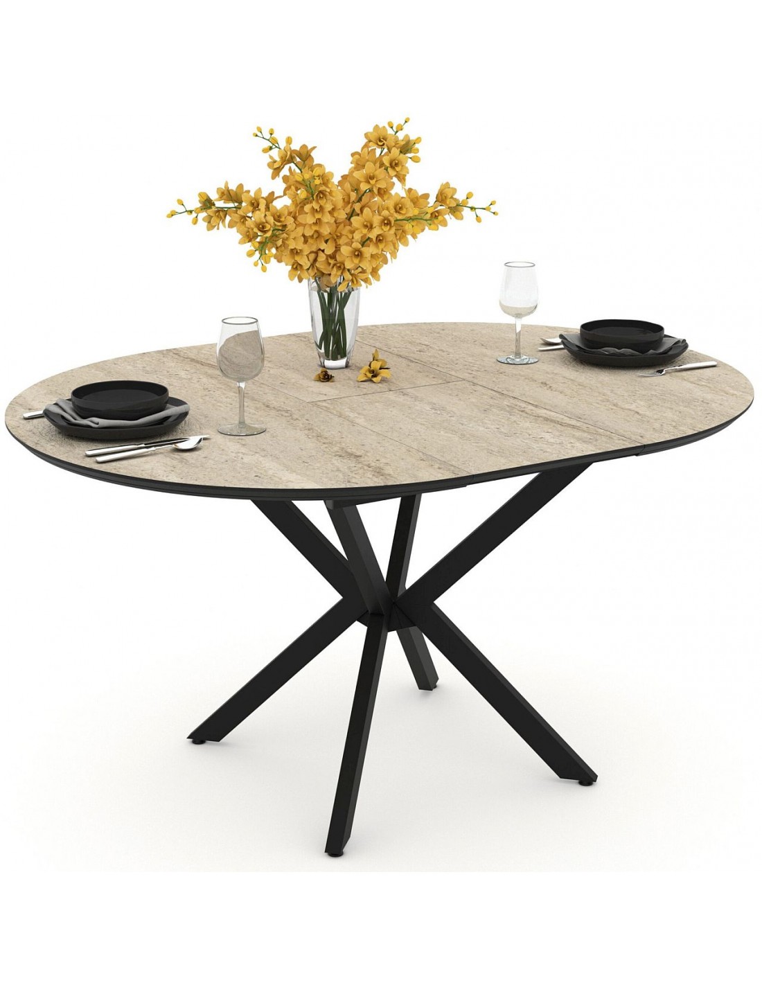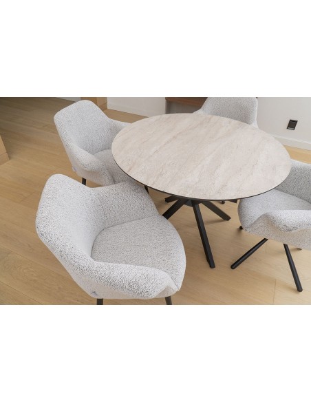 BOKO apaļais galds (Ø 110 cm) ir stilīgs un funkcionāls risinājums modernai ēdamistabai vai virtuvei. Pateicoties iebūvētajam pagarināšanas mehānismam, galds viegli izvelkams līdz 145 cm, nodrošinot vairāk vietas ģimenes maltītēm vai viesu uzņemšanai. Stabilā metāla kāju konstrukcija piešķir galdam izturību un elegantu, mūsdienīgu izskatu. Galda virsma ir praktiska un viegli kopjama, turklāt pieejama dažādās krāsās, lai to varētu pieskaņot dažādiem interjera stiliem.