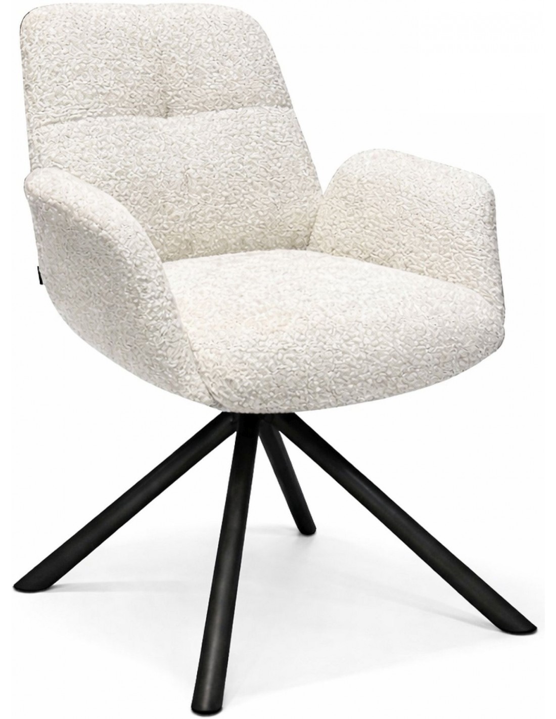 Mīksts atpūtas krēsls bēšā tonī ar rotācijas funkciju un buklē audumu, kas interjeram piešķir mājīgu un modernu stilu.