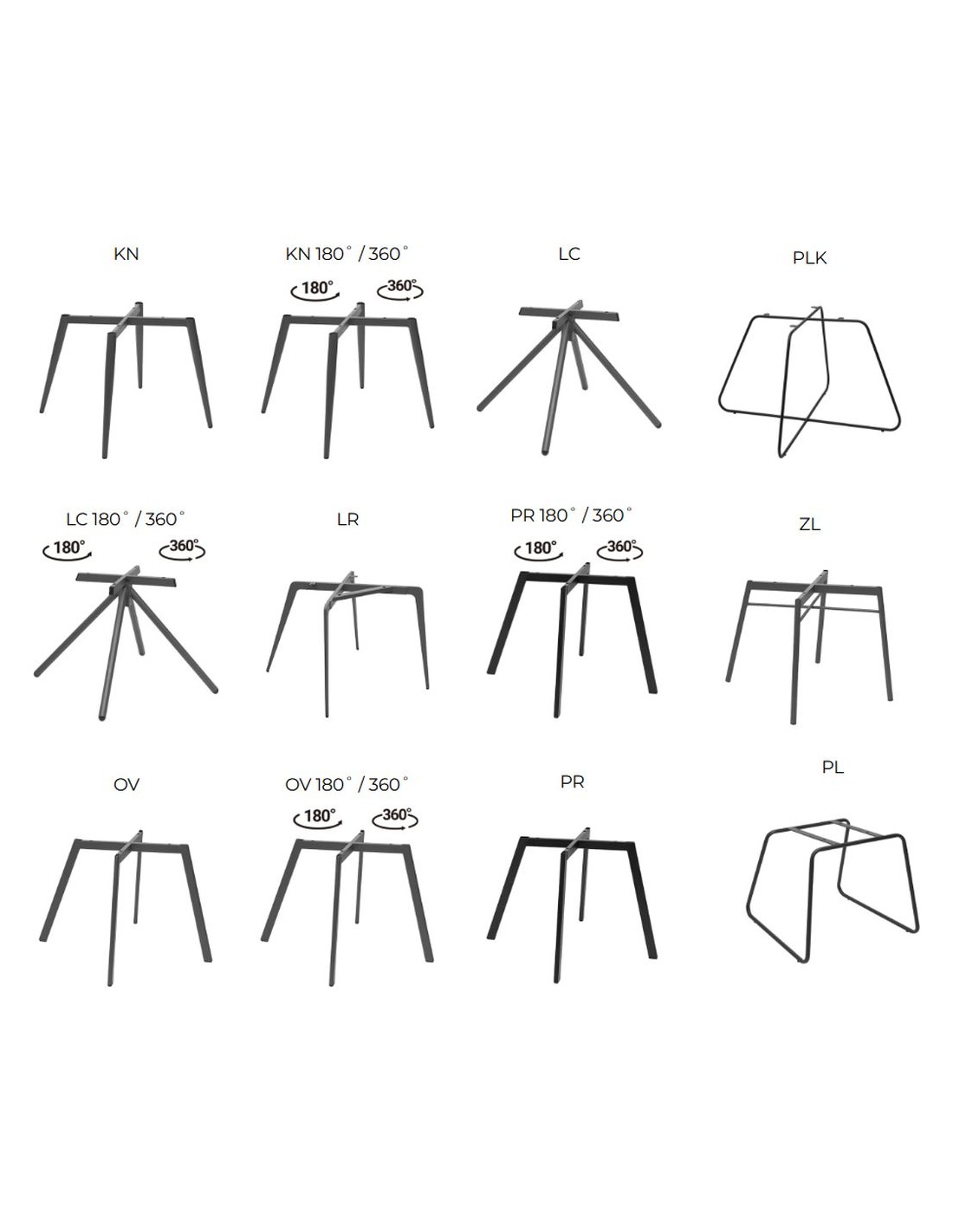 Krēslam iespējams pasūtīt dažāda veida kājas un izvēlēties to krāsu. Konkrētiem kāju modeļiem pieejama arī rotācijas funkcija - 180 grādu vai 360 grādu.
