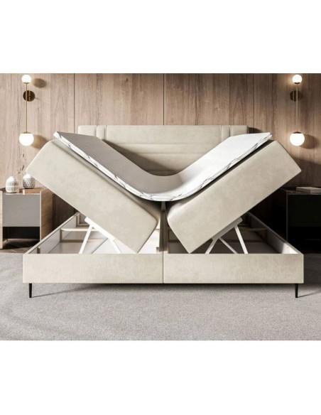 Gulta ir ārkārtīgi praktiska – pamatne sastāv no divām gultasveļas kastēm, kas atveras uz sāniem, nodrošinot daudz vietas mantu glabāšanai. Stabilitāti nodrošina neslīdošs audums, un 13 cm augstās kājas piešķir konstrukcijai elegantu vieglumu. Daudzslāņu konstrukcija ar 20 cm augstu bonell atsperu matraci un papildu 5 cm T-25 putu slāni nodrošina ērtu atpūtu un pareizu miega ergonomiku. 54 cm augstā konstrukcija ir praktiska un ērta ikdienas lietošanai.