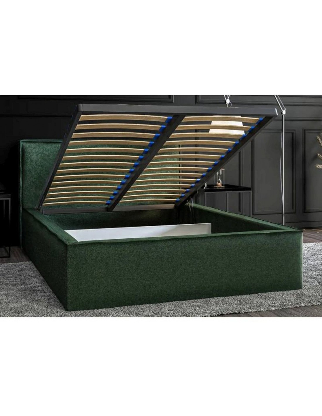 Šai gultai ir minimālistisks, tomēr stabils dizains – gluds galvgalis ar dekoratīvu 16 cm biezu apmali rada greznības sajūtu un izcilu vizuālo efektu. Izturīgā pamatne ir izgatavota no plāksnes ar metāla rāmi, kas atveras no priekšpuses, padarot piekļuvi gultasveļas kastei ārkārtīgi ērtu. Konstrukciju balsta atsperu līstes – kopā 50 vienības (25 katrā pusē) nodrošina vienmērīgu svara sadalījumu un komfortu miega laikā.