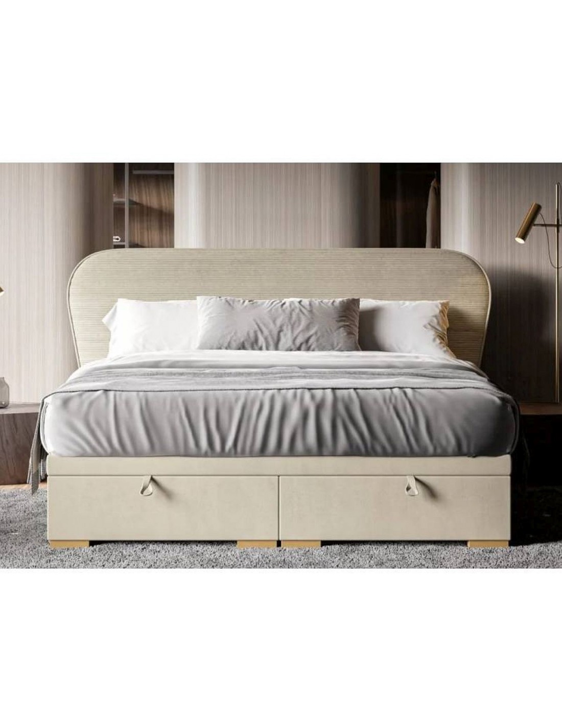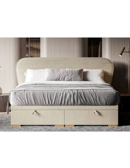 Moderna gulta BODEMA ar galvgali, kuras stūri ir glīti noapaļoti un uz priekšu atveramām veļas kastēm – stils un funkcionalitāte vienā.