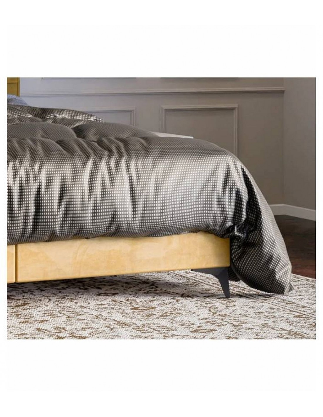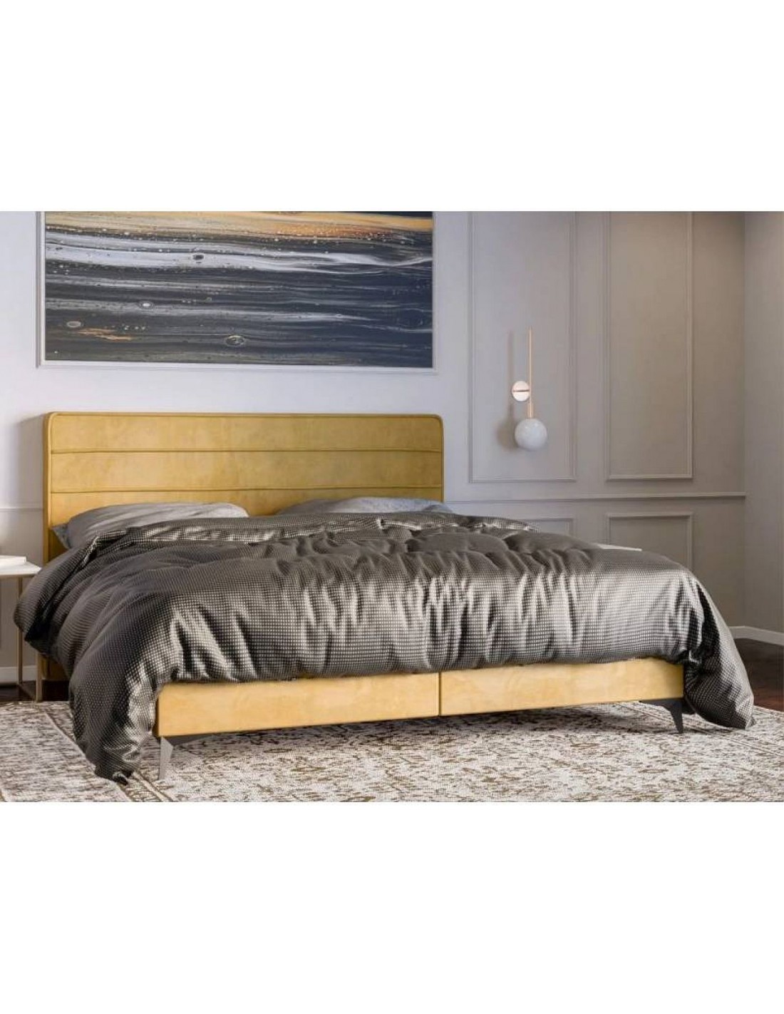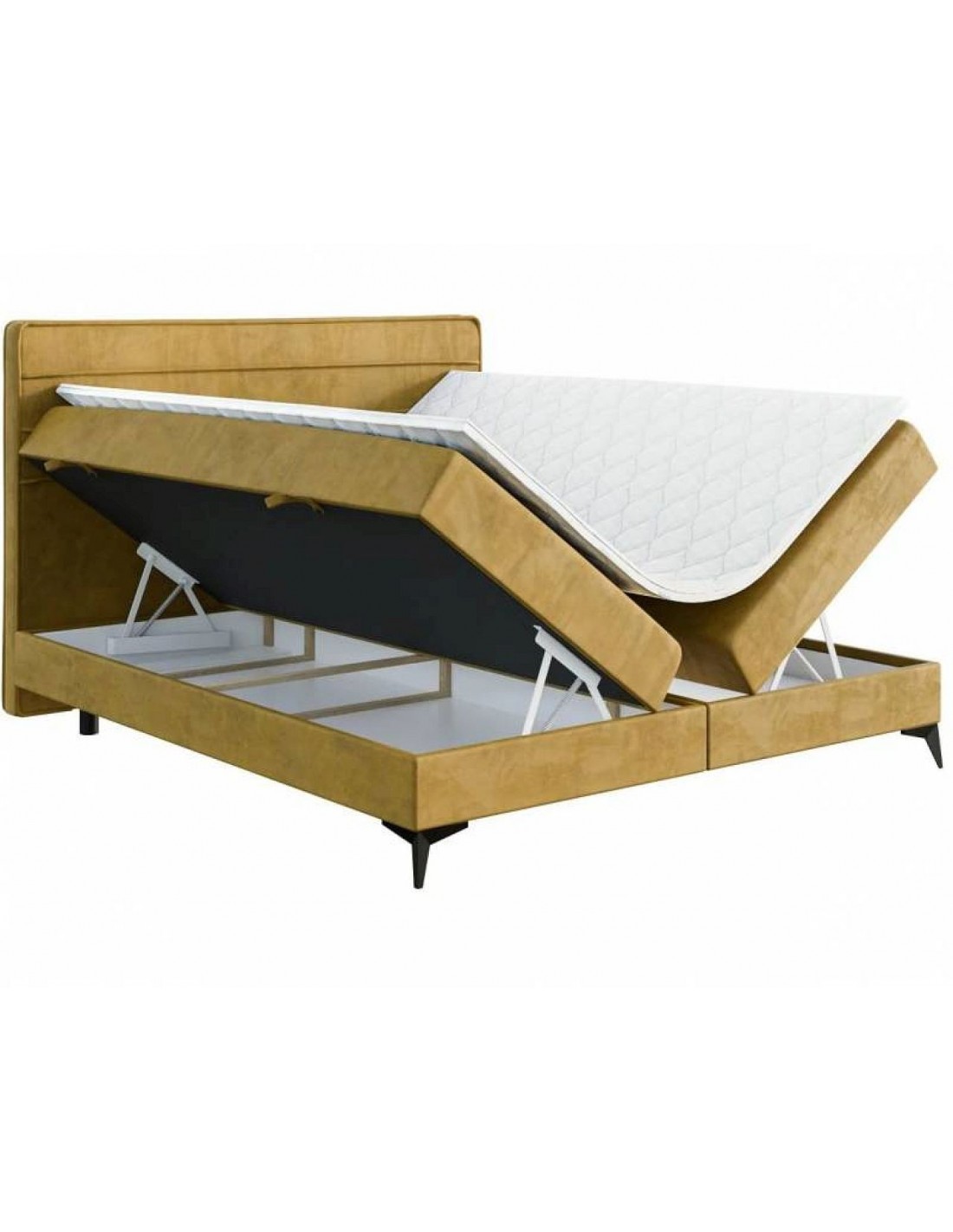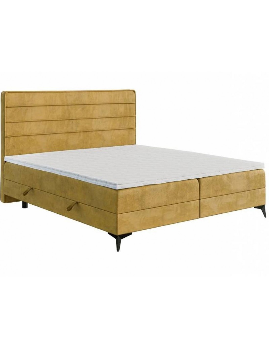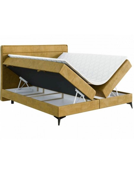 Horizo ​​gultai ir horizontālas šuves un eleganta apdare ap galvgali, piešķirot tai smalku izsmalcinātības pieskārienu. Baltā plātnes pamatne nodrošina stabilitāti, savukārt ietilpīgās veļas kastes – praktiskumu. Bonell atsperu matracis ar T-25 putām un ērtu matrača virsmatraci nodrošina komfortablu atpūtu. Neslīdošais audums uz starpsienām palielina drošību, bet zemās kājas (2 cm) un 54 cm konstrukcijas augstums garantē ērtu lietošanu.