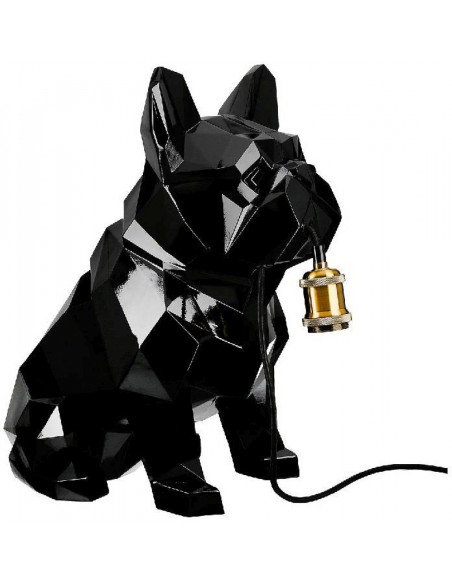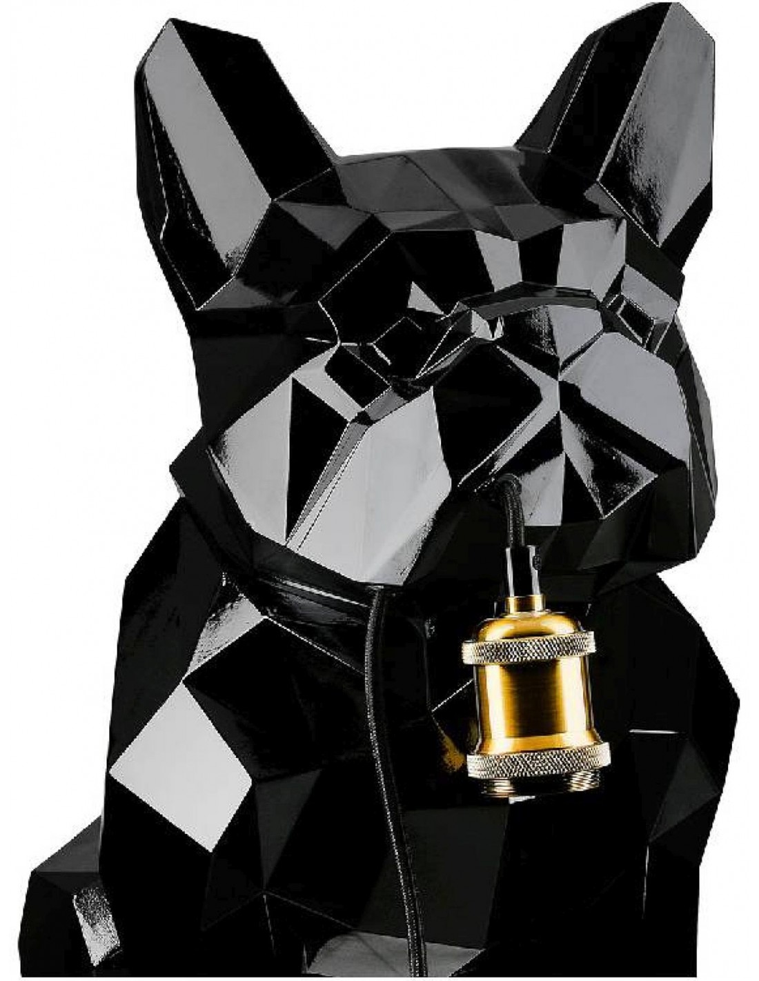 BULLDOG lampa – melna, spīdīga buldoga figūra, kas zobos tur spuldzīti. Ekskluzīvs, rotaļīgs un moderns interjera akcents.