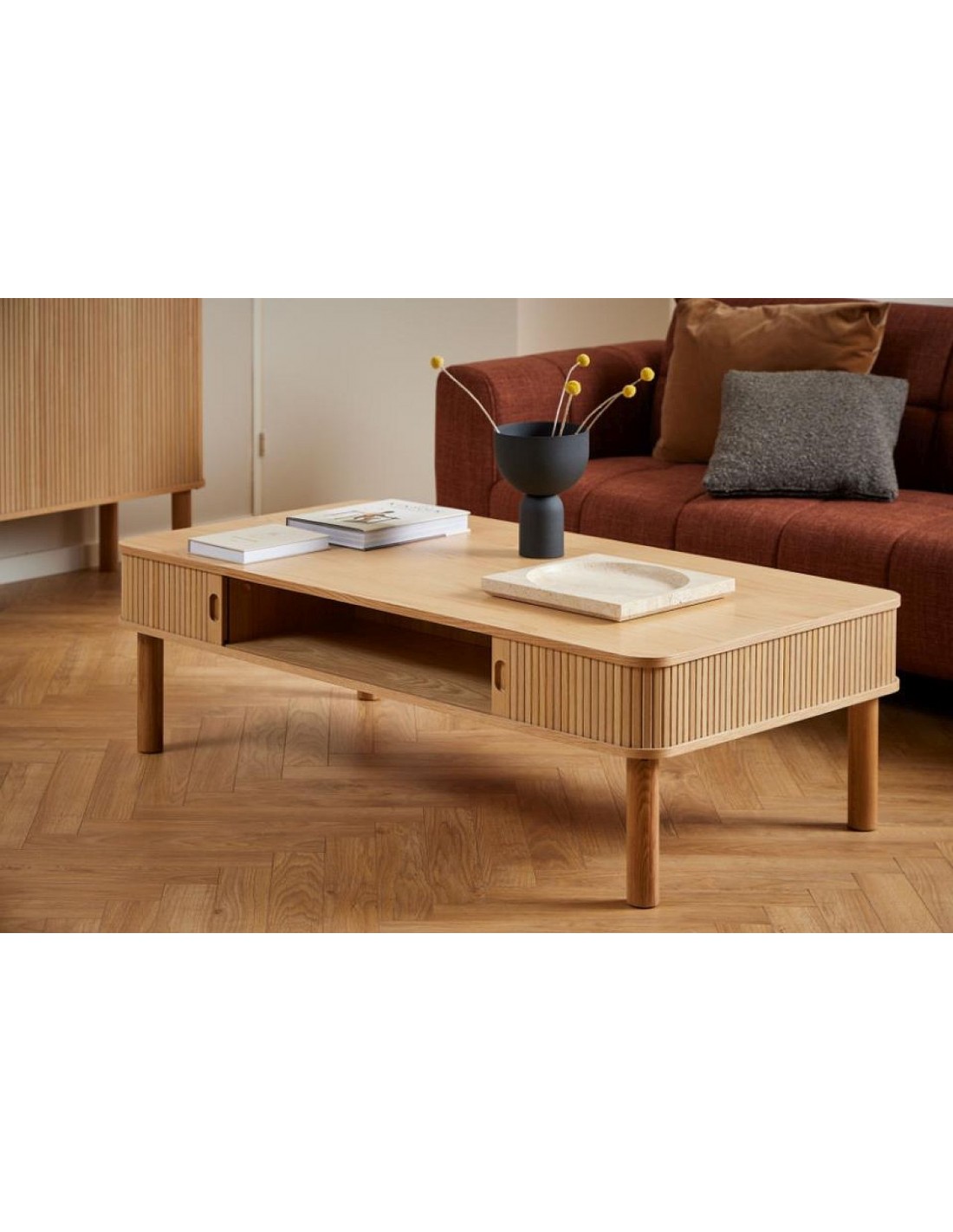 Kafijas galdiņš ar dabīga ozolkoka finierējuma virsmu ir izturīga, funkcionāla un eleganta izvēle jūsu viesistabai.