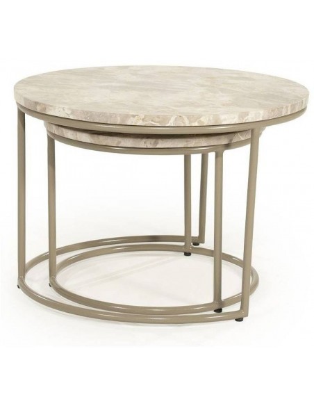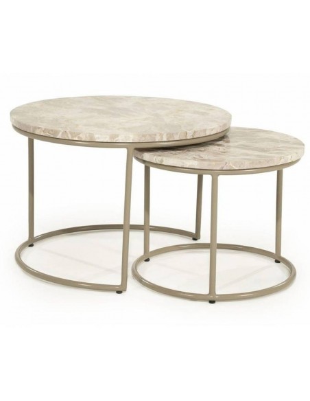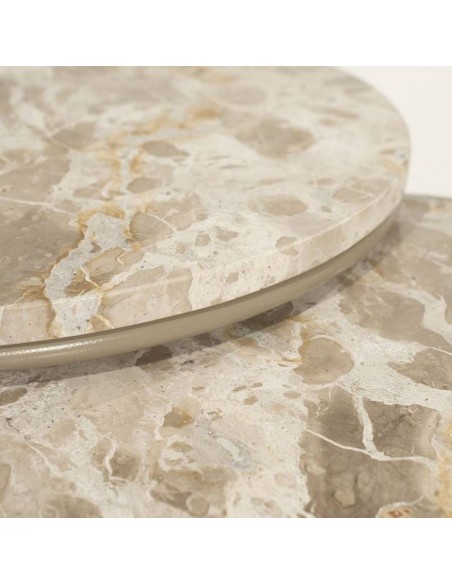 ALVAR kafijas galdiņu komplekts ir elegants un funkcionāls risinājums, kas apvieno dabīgā marmora greznību ar izturīgu metāla konstrukciju. Galda virsmas ir izgatavotas no pulēta marmora, kam ir raksturīgs raksts un smalks spīdums, savukārt metāla rāmji, kas pārklāti ar aizsargpārklājumu, nodrošina stabilitāti un izturību.