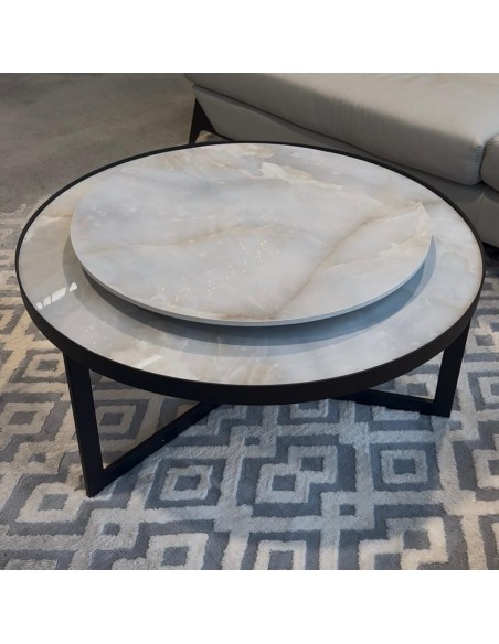 Moderns apaļš kafijas galdiņš ar spīdīgu keramiku un rotējošu paplāti ir praktisks, stilīgs un ekskluzīvs interjera akcents.