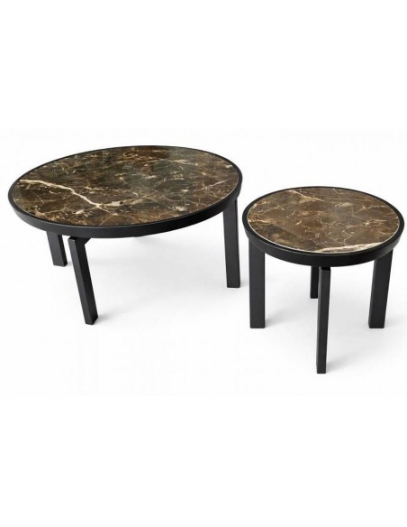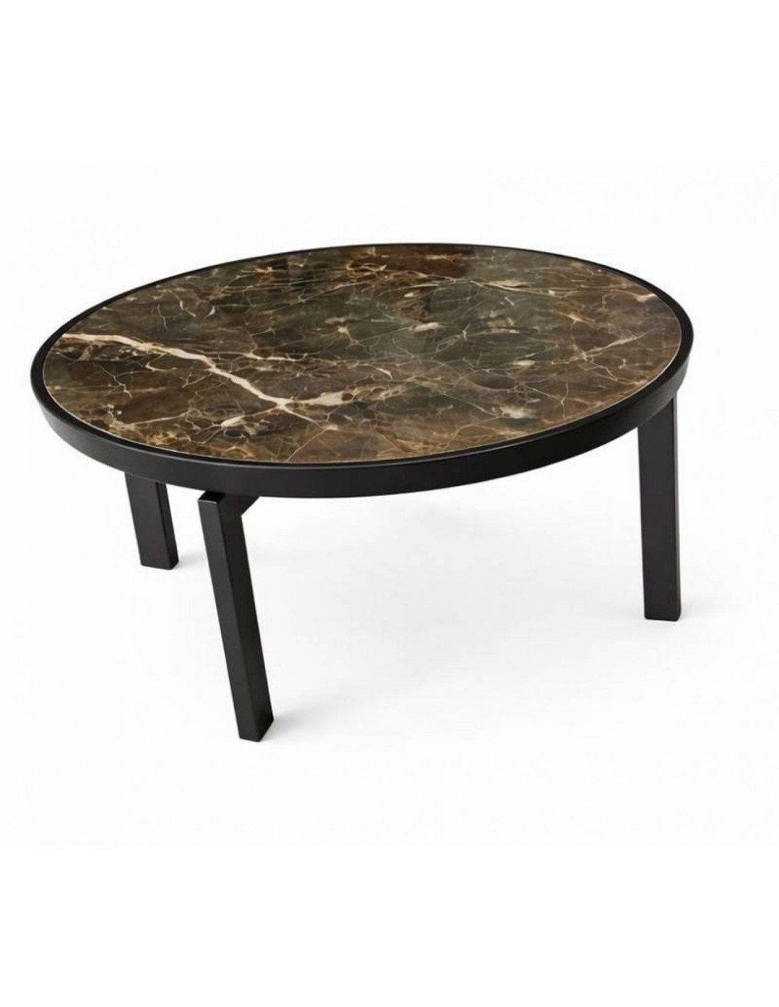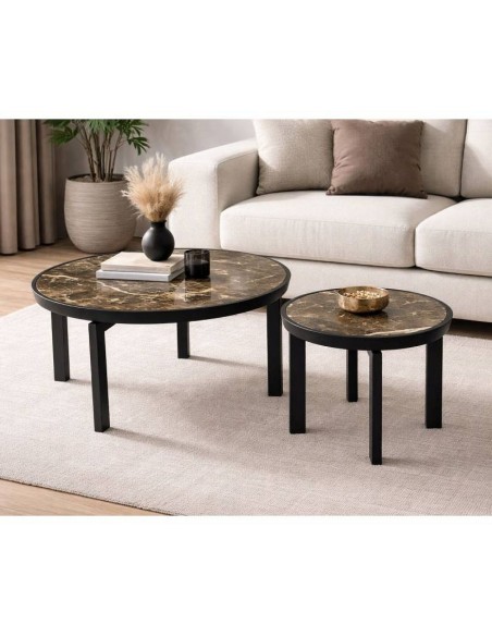 Apaļš kafijas galdiņš ar tumši brūnu raibu keramikas virsmu un melnām kājām, radot modernu un solīdu interjera akcentu.