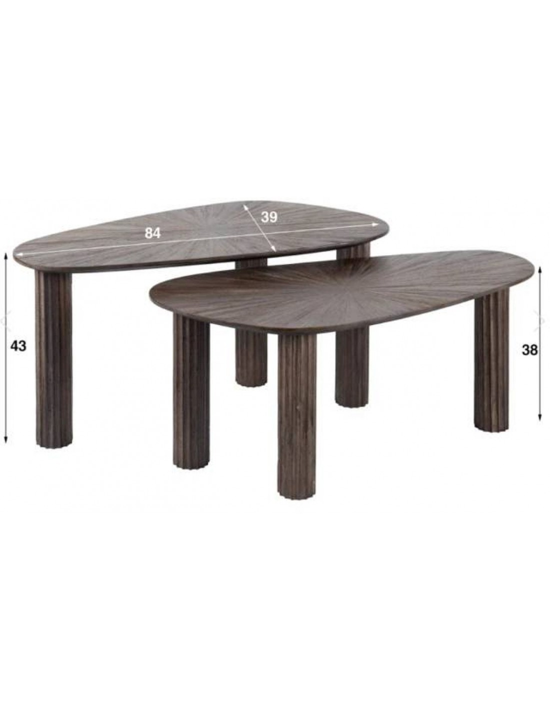 MAYA kafijas galdiņu komplekts izceļas ar organiskām formām un greznu masīva tīkkoka apdari. Tumši brūnais espresso tonis piešķir mēbelei solīdumu, savukārt viļņotais kāju raksts un izteiksmīgā galda virsmas tekstūra rada unikālu dizaina akcentu.