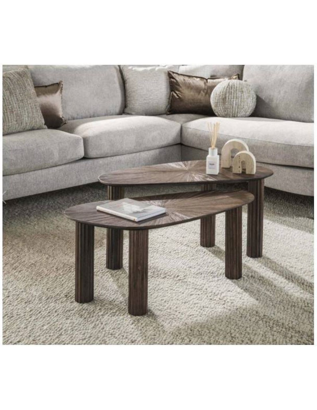Abus galdus var izmantot kopā vai atsevišķi, tāpēc tos var viegli pielāgot dažādām telpas vajadzībām. Tas ir funkcionāls un estētisks risinājums modernai dzīvojamai istabai, kurā tiek meklēti dabiski materiāli un atšķirīgs stils.