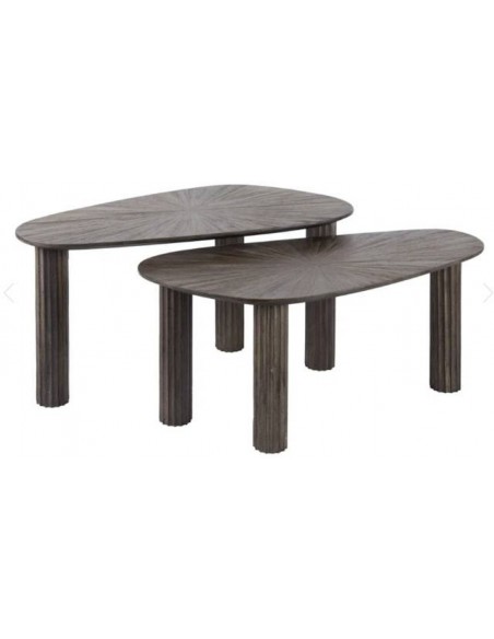 Divu organiskas formas kafijas galdiņu komplekts, kas izgatavots no masīva, krāsota tīkkoka, piešķirot interjeram dabisku un ekskluzīvu sajūtu.