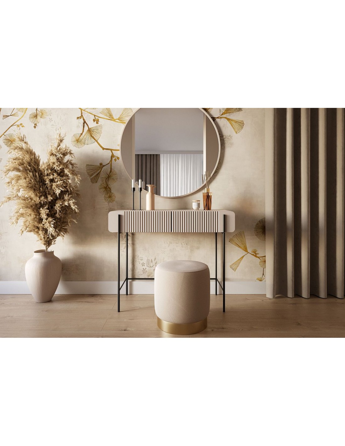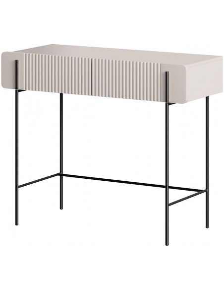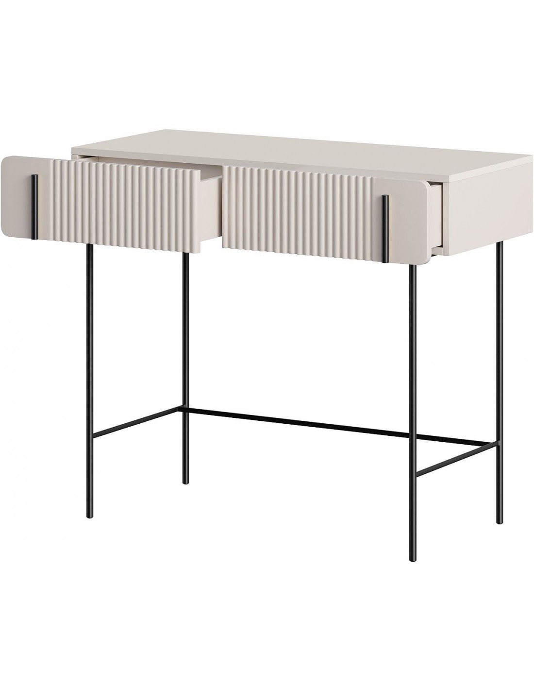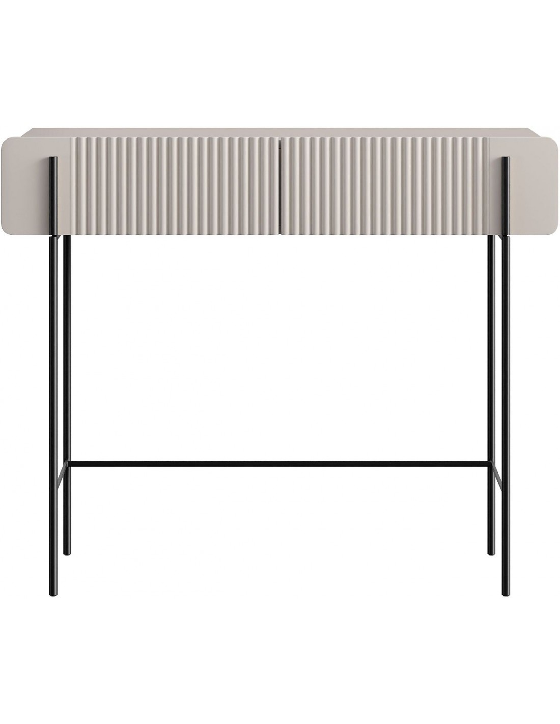 Metāla rāmja tipa pamatne nodrošina stabilitāti un vizuāla viegluma sajūtu, savukārt filca paliktņi pasargā grīdas no skrāpējumiem. Konsolei ir ietilpīga atvilktne, kas atveras ar "Push to open" sistēmu— bez rokturiem, saglabājot tīru, modernu dizainu. "Soft close" mīkstā  aizvēršanas sistēma nodrošina klusu darbību, padarot šīs mēbeles ideāli piemērotas gan guļamistabai, gan gaitenim vai viesistabai.
