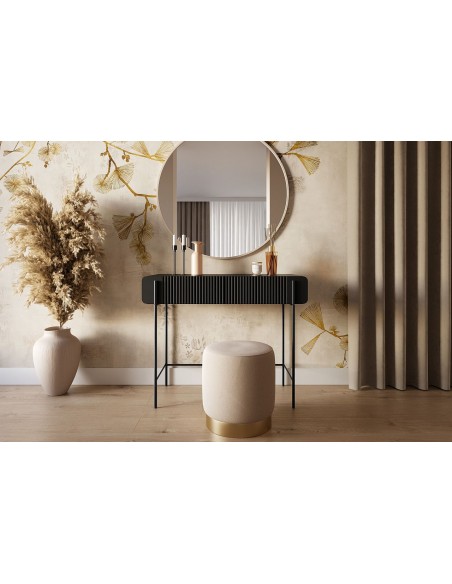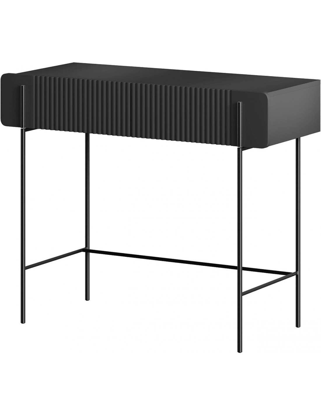 Metāla rāmja tipa pamatne nodrošina stabilitāti un vizuāla viegluma sajūtu, savukārt filca paliktņi pasargā grīdas no skrāpējumiem. Konsolei ir ietilpīga atvilktne, kas atveras ar "Push to open" sistēmu— bez rokturiem, saglabājot tīru, modernu dizainu. "Soft close" mīkstā aizvēršanas sistēma nodrošina klusu darbību, padarot šīs mēbeles ideāli piemērotas gan guļamistabai, gan gaitenim vai viesistabai.