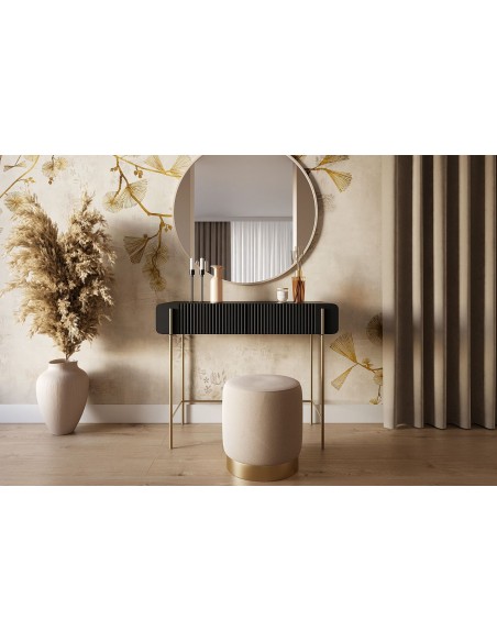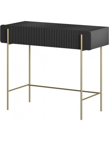 Metāla rāmja tipa pamatne nodrošina stabilitāti un vizuāla viegluma sajūtu, savukārt filca paliktņi pasargā grīdas no skrāpējumiem. Konsolei ir ietilpīga atvilktne, kas atveras ar "Push to open" sistēmu— bez rokturiem, saglabājot tīru, modernu dizainu. "Soft close" mīkstā aizvēršanas sistēma nodrošina klusu darbību, padarot šīs mēbeles ideāli piemērotas gan guļamistabai, gan gaitenim vai viesistabai.