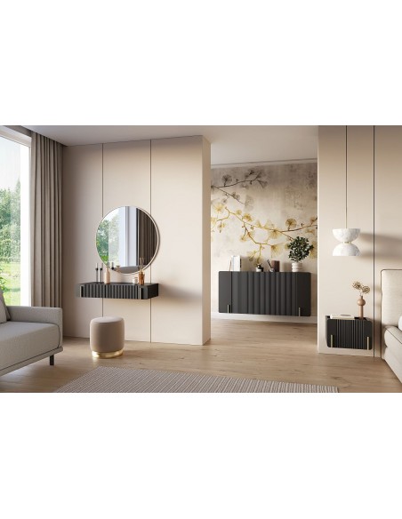 Konsole ir stiprināma pie sienas. Konsolei ir ietilpīga atvilktne, kas atveras ar "Push to open" sistēmu— bez rokturiem, saglabājot tīru, modernu dizainu. "Soft close" mīkstā aizvēršanas sistēma nodrošina klusu darbību, padarot šīs mēbeles ideāli piemērotas gan guļamistabai, gan gaitenim vai viesistabai.
