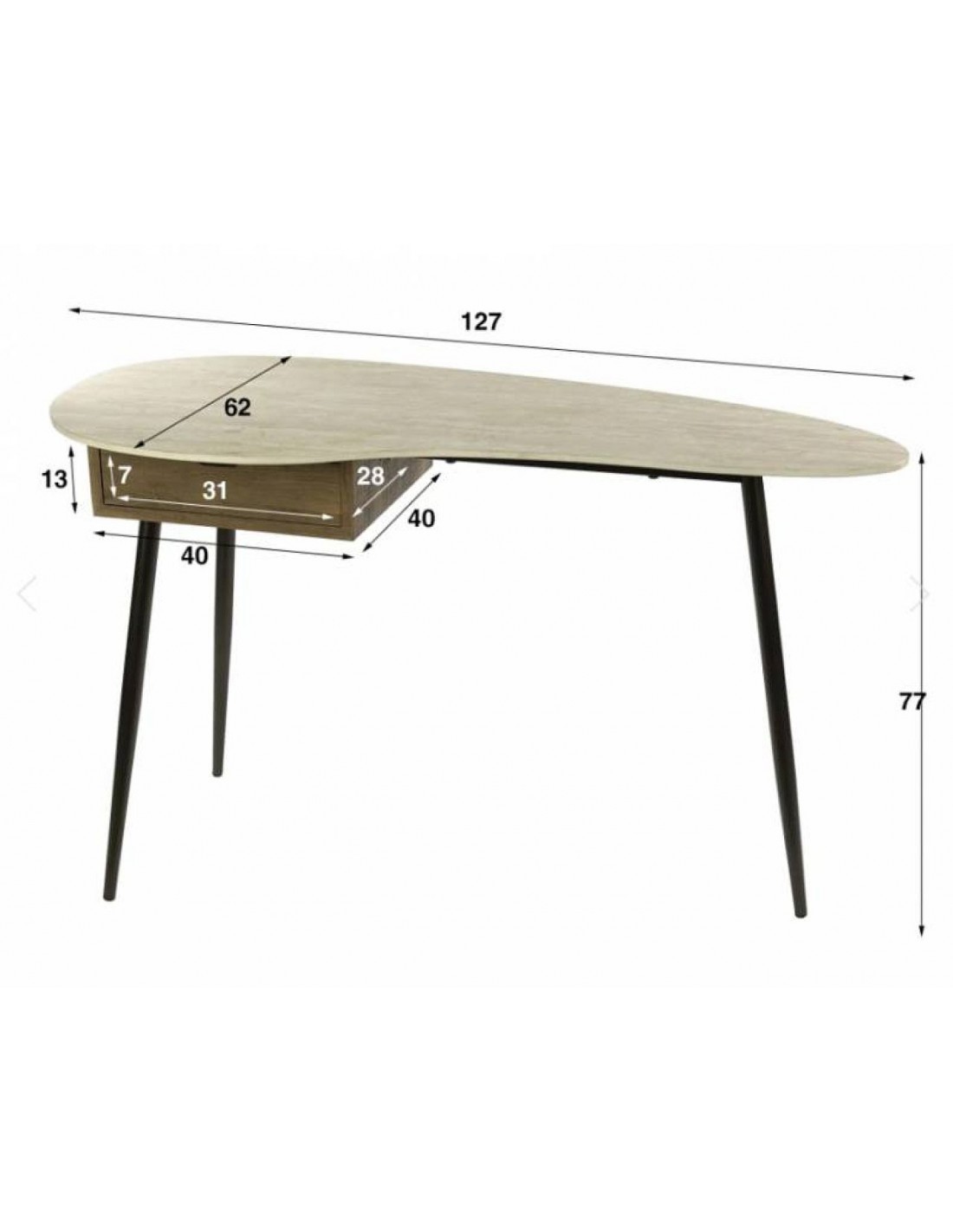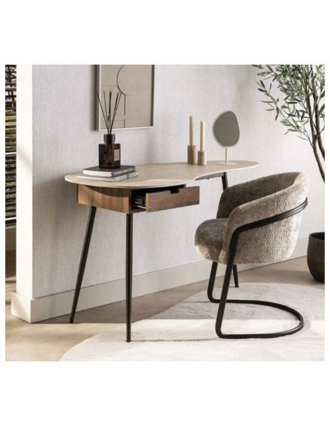 Eleganta konsole ar organiskas formas keramikas virsmu travertīna apdarē, atvilktni un bronzas krāsas metāla kājām.