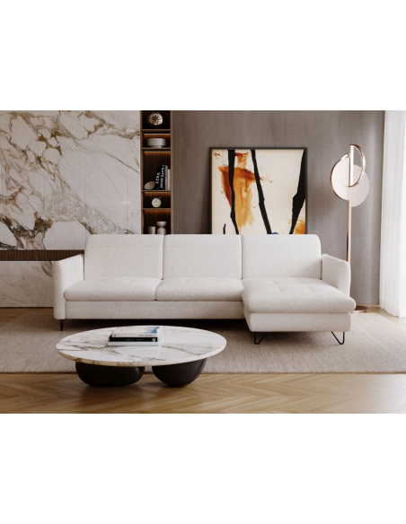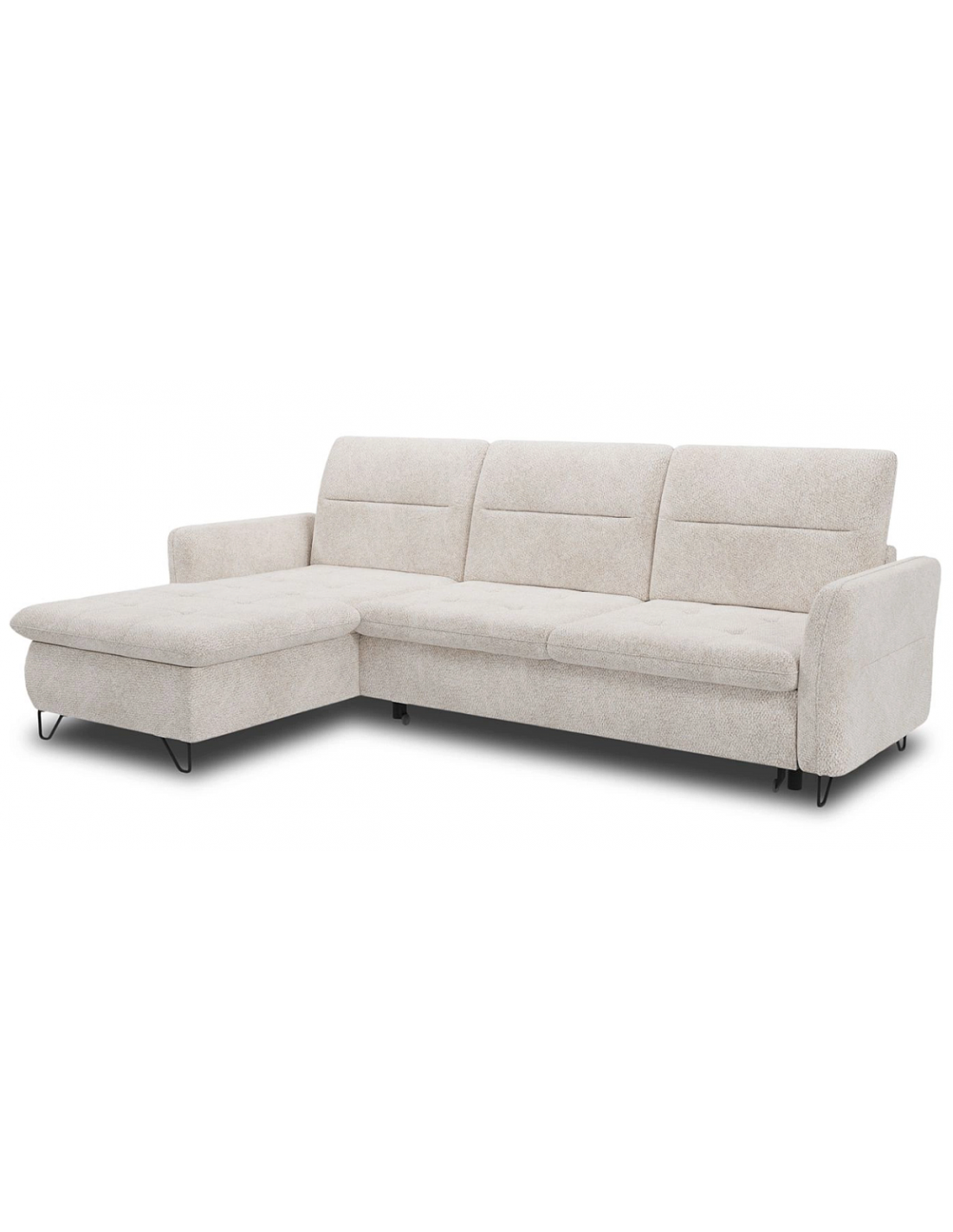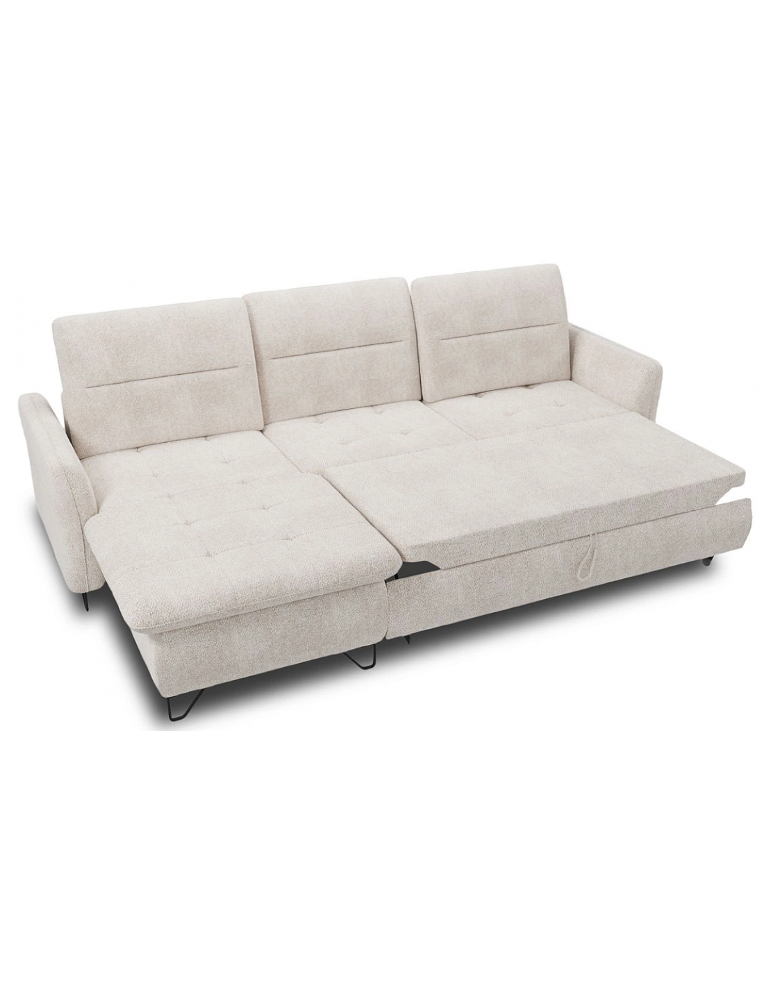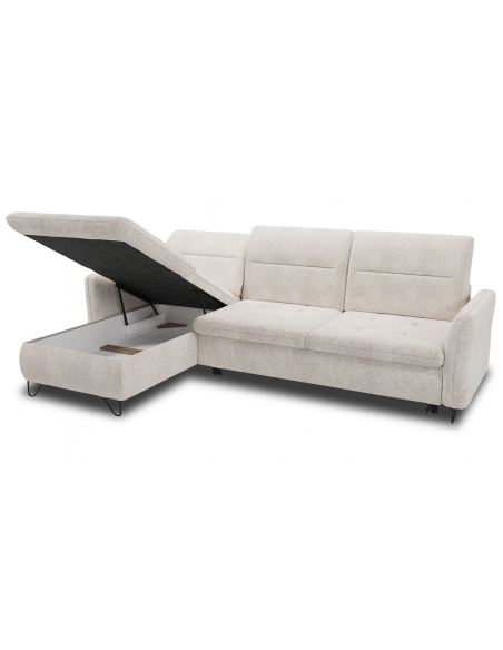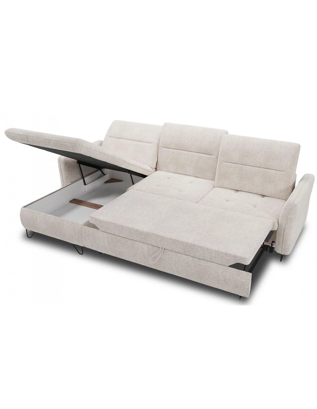 FIESTA stūra dīvāns ar guļamfunkciju ir moderna mēbele ar ietilpīgu uzglabāšanas nodalījumu, ērtu salocīšanas mehānismu un mīkstu sēdekli.