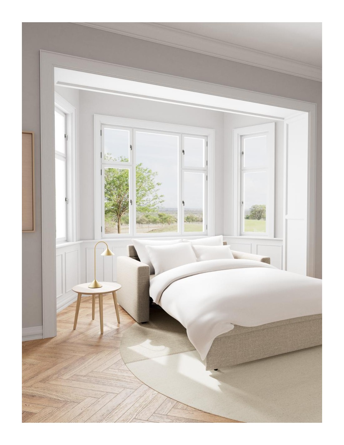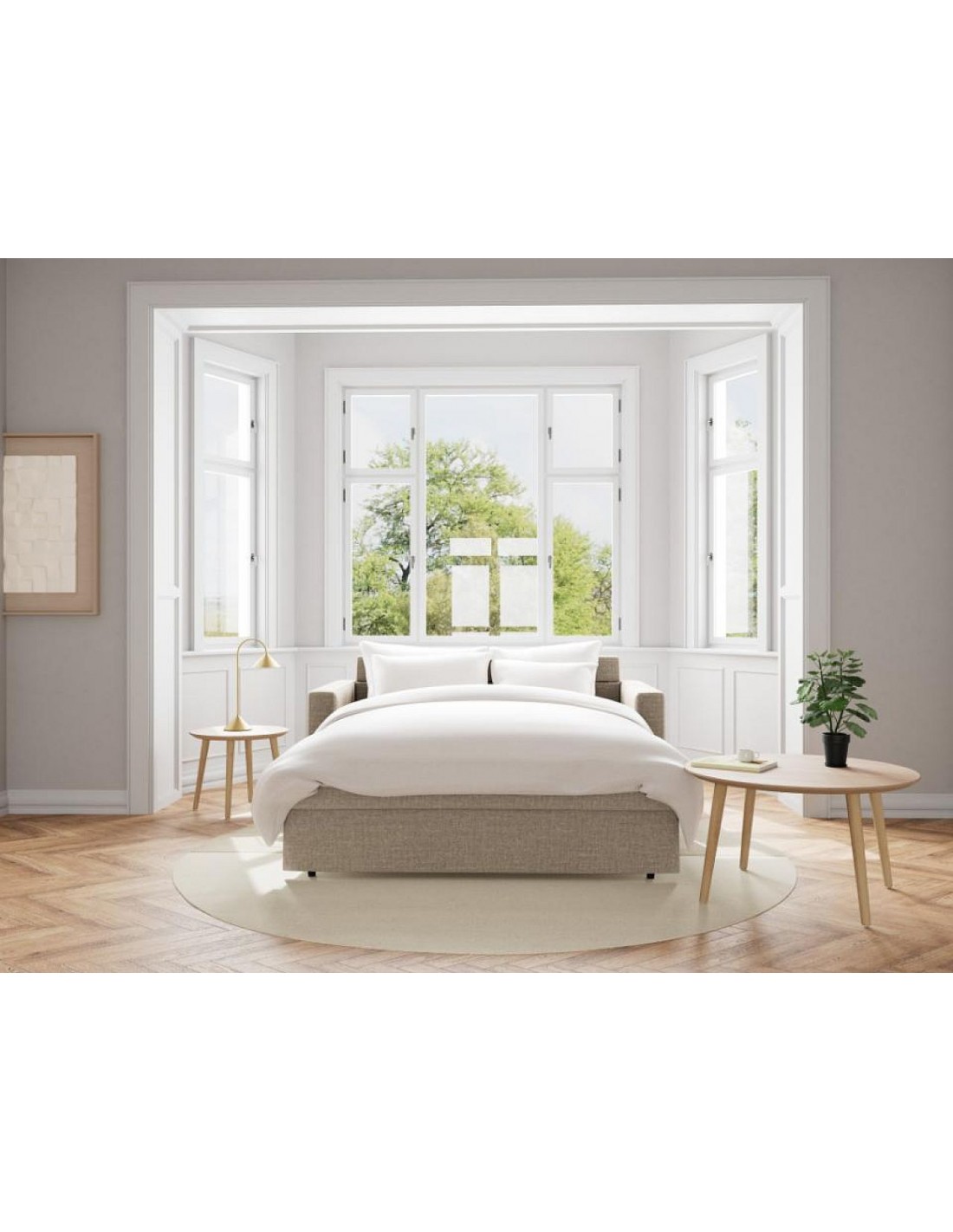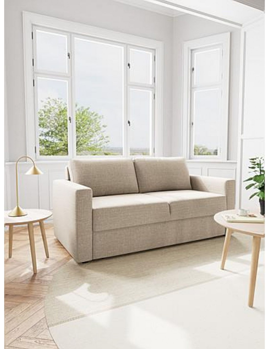 Guļamdīvāns FLEURY izceļas ar savu klasisko dizainu, taisnām līnijām un ērtiem roku balstiem, kas piešķir mēbelei stabilitāti un eleganci. Bēškrāsas audums ar neuzkrītošu divtoņu efektu rada komforta sajūtu un viegli iederas dažādos interjeros.