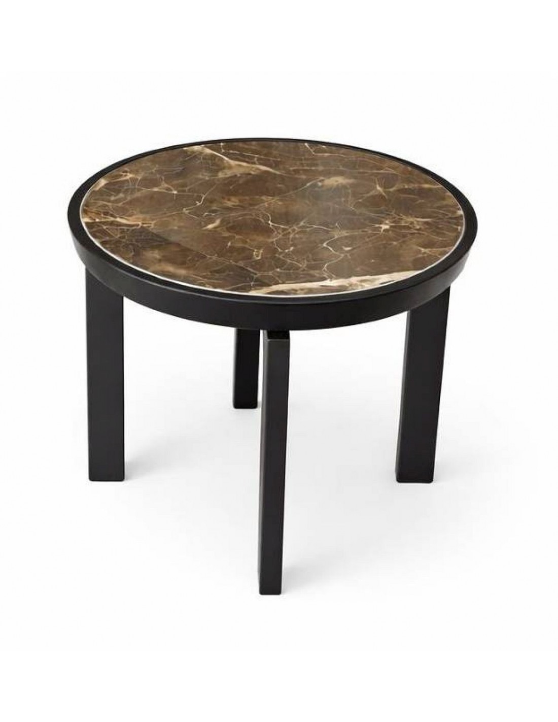 Kompakts sānu galdiņš ar tumši brūnu raibu keramikas virsmu un melnām kājām, kas interjeram piešķir modernu akcentu.
