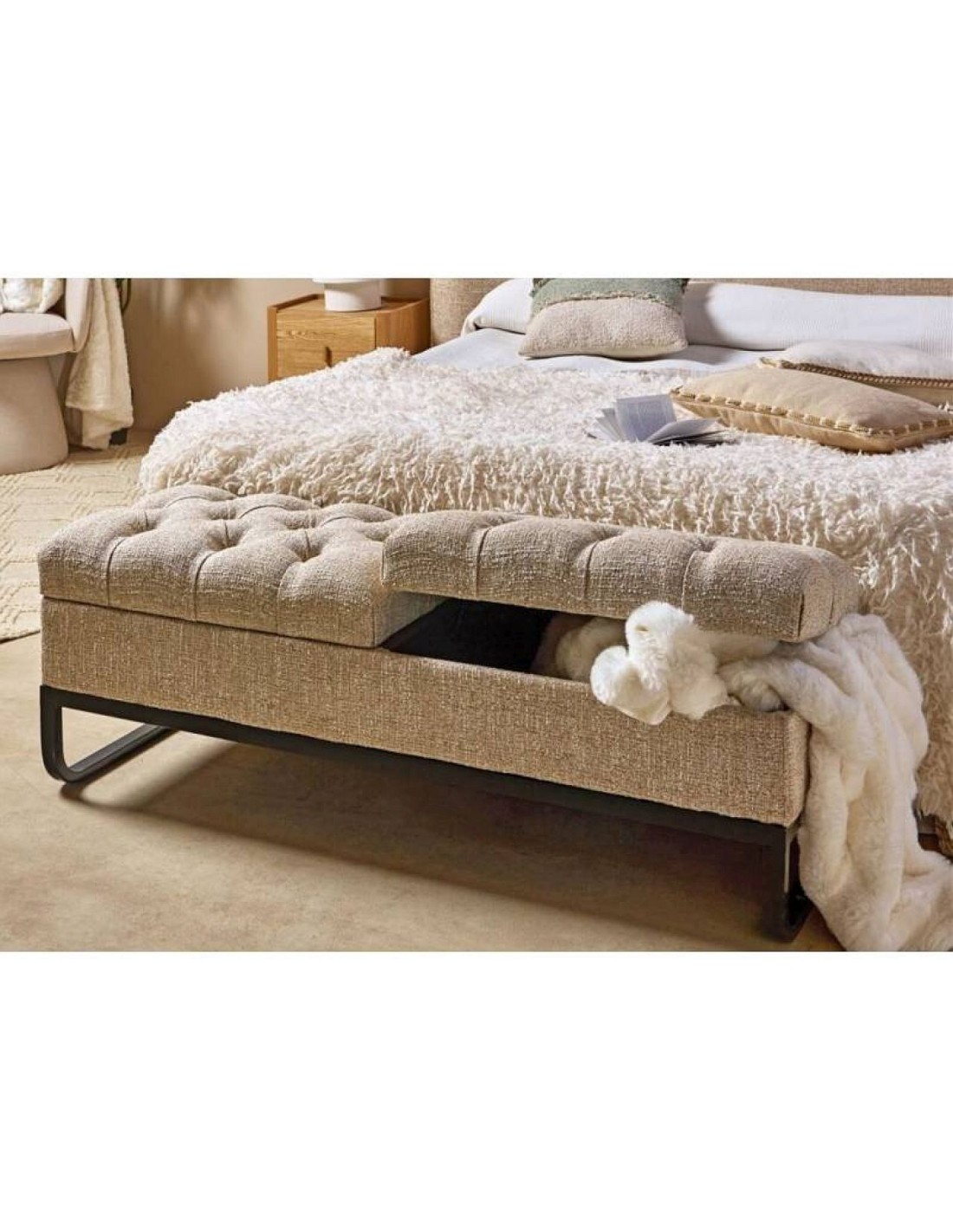 SOFI sols ir elegants, ar mīkstu audumu un praktisku uzglabāšanas vietu. Ērta un stilīga izvēle jūsu mājām.
