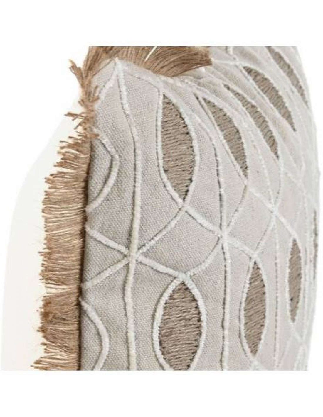 Bohēmiska stila spilvens ar savītu, krustojošu rakstu ar redzamiem pavedieniem starp tiem. Vītņotas malas piešķir spilvenam rotaļīgu pieskārienu. Bēša priekšpuse un balta aizmugure. Spilvens ar rāvējslēdzēju, lai varētu regulēt pildījuma daudzumu un izvēlēties spilvena biezumu.