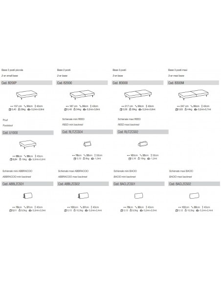 Dīvāns tiek izgatavots pēc moduļu sistēmas. Ir pieejami arī citi izmēri, konfigurācijas iespējas un krāsu izvēle.  Muguras balsti ir mobili un nav savienoti ar dīvānu, tos iespējams noņemt vai pārvietot jebkurā jums vēlamajā brīdī un pozīcijā.
