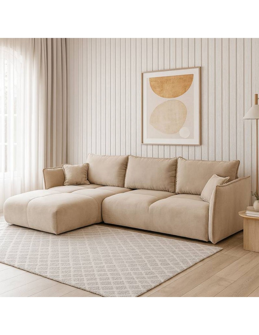 Plašs stūra dīvāns CARMINA ar gulēšanas funkciju un gultasveļas kasti ir moderna, ērta un daudzpusīga izvēle jūsu viesistabai.
