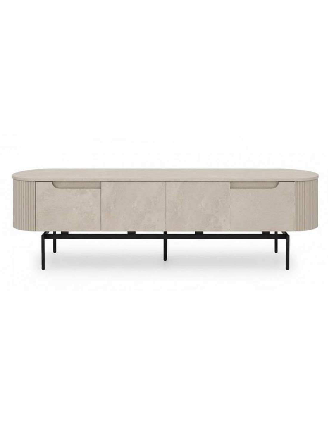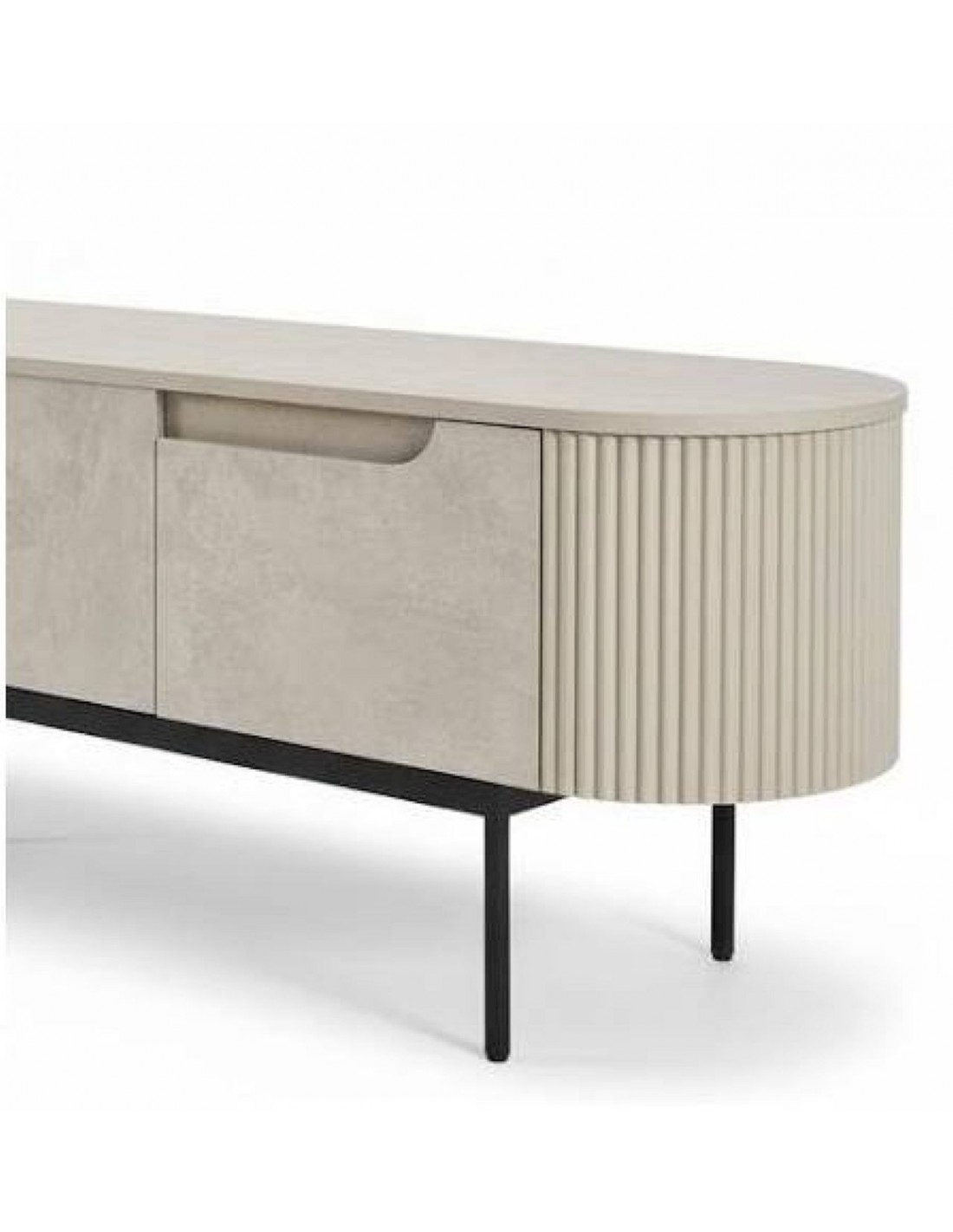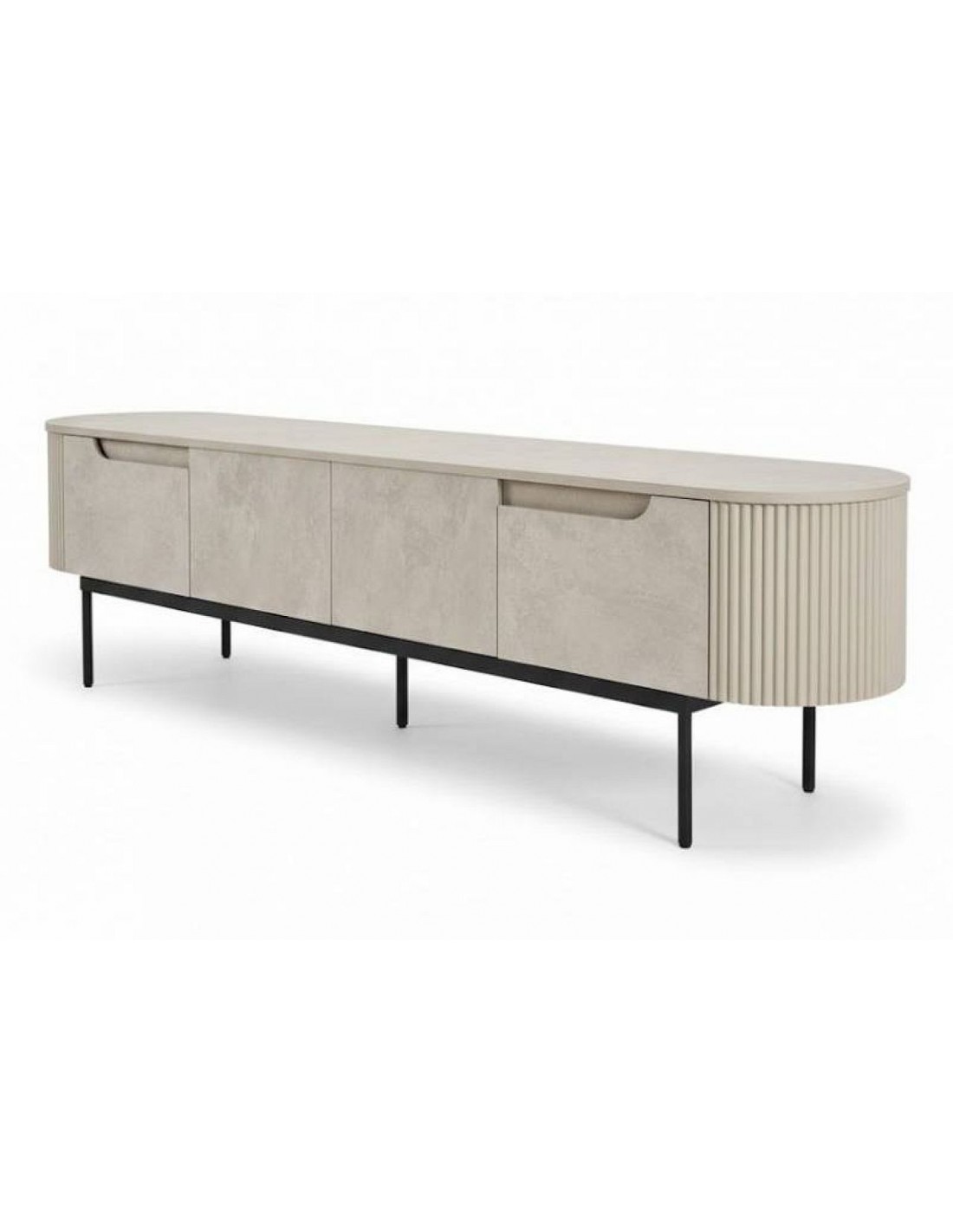 TEMPO – krēmkrāsas TV skapītis ar izliektām malām un elegantām detaļām.