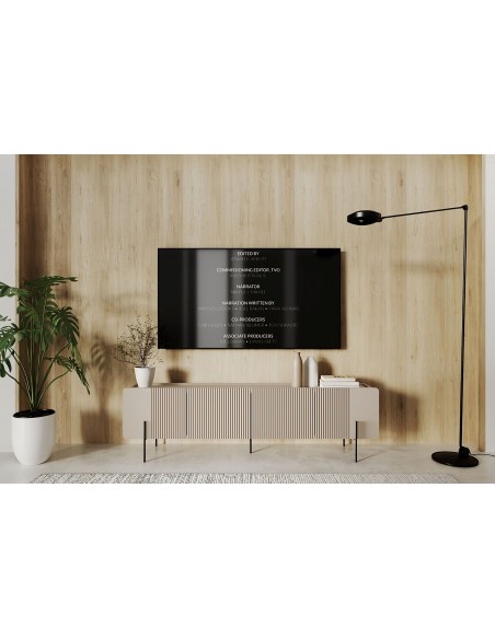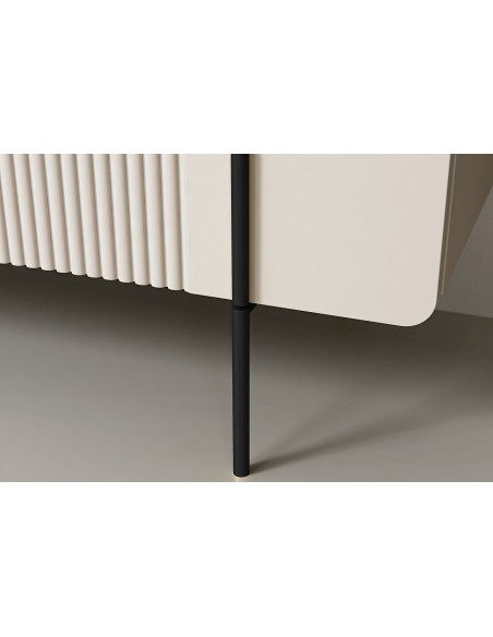 MALMI TV skapītis ir eleganta, minimālistiska dizaina mēbele, kas radīta mūsdienīgam interjeram. Tā priekšpusi rotā smalks reliefs, kas piešķir mēbelei raksturu un unikalitāti. Laminētās plātnes konstrukcija ir izturīga un viegli kopjama, savukārt metāla rāmja tipa kājas nodrošina stabilitāti un vizuāla viegluma sajūtu.