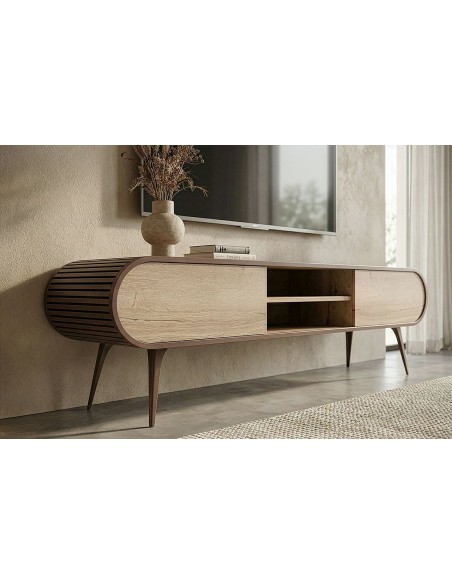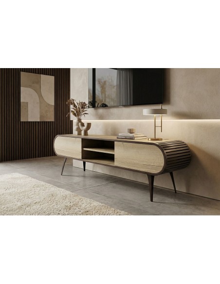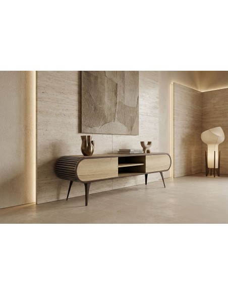 Izgatavots pēc Accanto grupas pasūtījuma (EG)Plašs TV galdiņš ORIST ar atvērta un aizvērta tipa plauktiem, finierētu korpusu un metāla kājām - glītai un modernai viesistabai.
