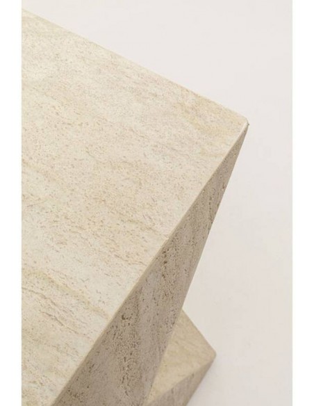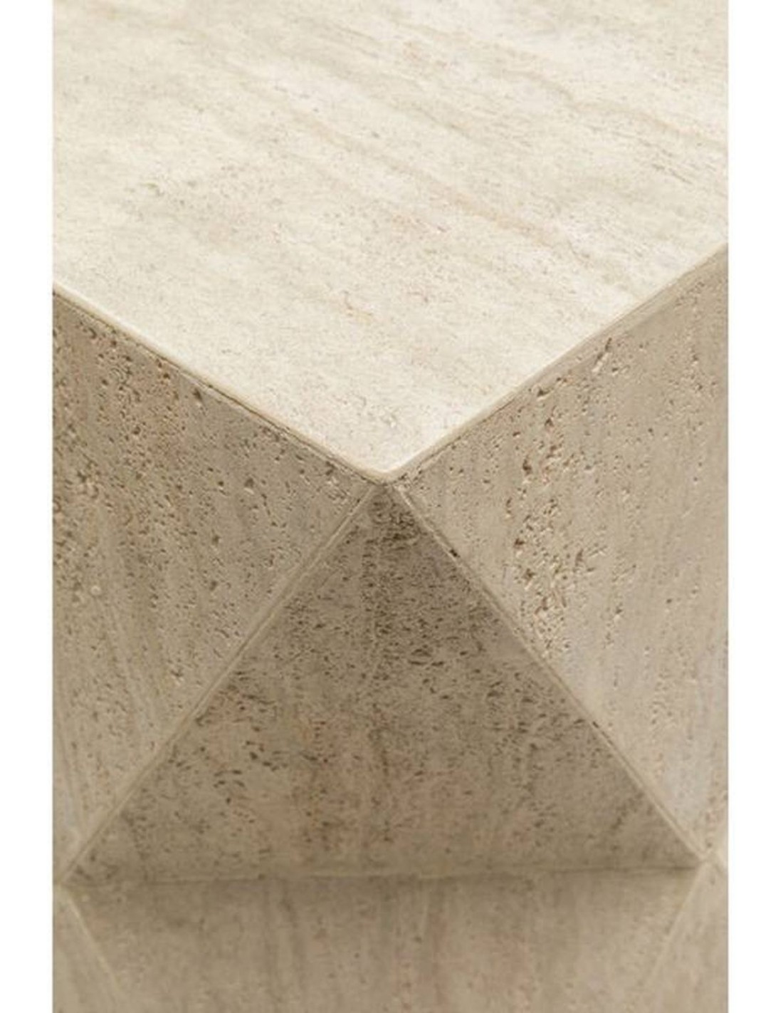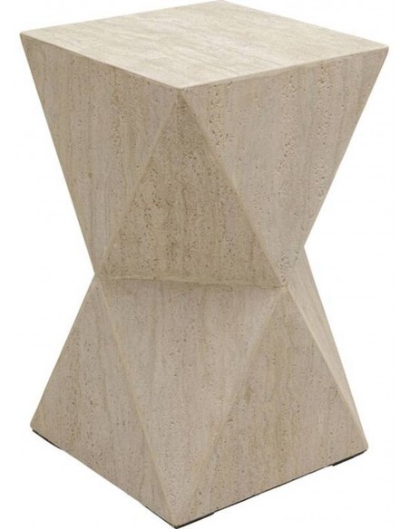 Sānu galdiņam LUXURY TRAVERTINO ir stabils dizains. Virsma izskatās pēc travertīna akmens, bēšā krāsā, šūnveida. Siluets sastāv no divām savienotām piramīdām. Tas ir ne tikai lielisks akcents viesistabā vai citā telpā, bet arī unikāla mēbele mākslas studijā vai citā radošā vidē. Var izmantot kā pjedestālu dažādiem priekšmetiem.