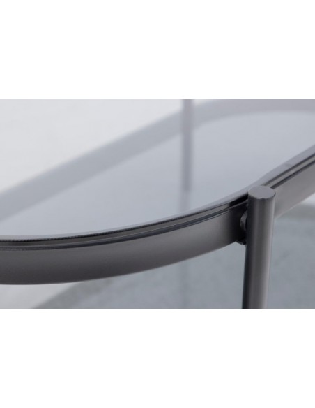 Šis kafijas galdiņš izceļas ar modernu minimālistisku dizainu un smalku stikla virsmu. Rūdītais dūmotais stikls izskatās grezni, vienlaikus ir izturīgs pret ikdienas lietošanu un viegli kopjams. Melnais tērauda rāmis ar matētu pulverkrāsojumu nodrošina stabilitāti un izturību, piešķirot konstrukcijai modernu raksturu. Pateicoties savam izmēram, galdiņš ērti iederas viesistabā – tā ir lieliska vieta dzērieniem, uzkodām vai dekoratīviem aksesuāriem. Elegantais izskats padara šo mēbeli viegli pieskaņojamu modernam vai industriālam interjeram.