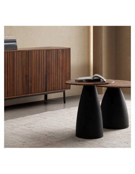 Tērauda pamatne, kas pārklāta ar epoksīda pulverkrāsu, ir izturīga un ar raksturīgu materiāla efektu. Melnā krāsa kontrastē ar silto koka toni, radot harmonisku un stilīgu līdzsvaru.