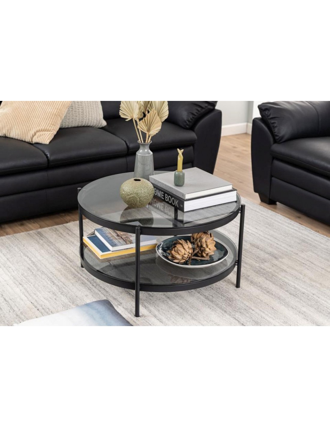 Kafijas galdiņš ar dūmotu stiklu un melnu tērauda rāmi ir moderna, eleganta un praktiska izvēle viesistabai.
