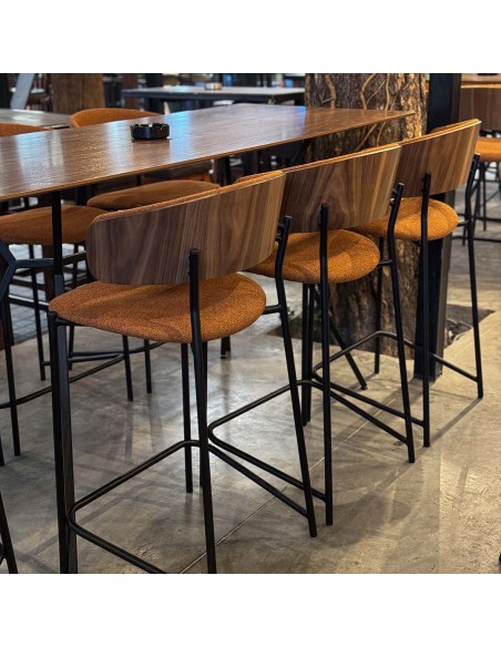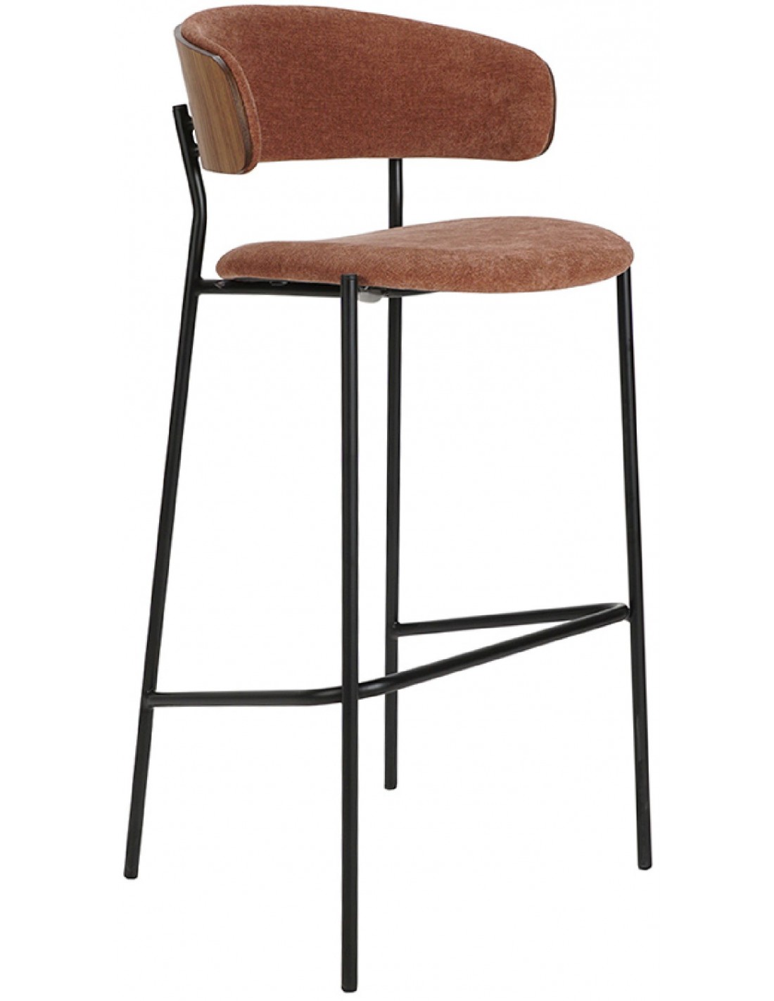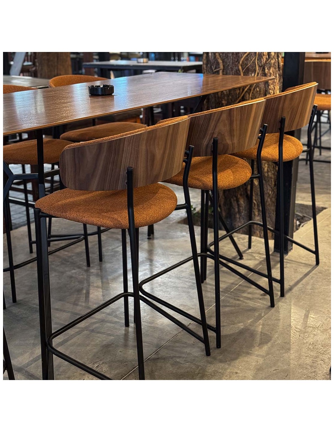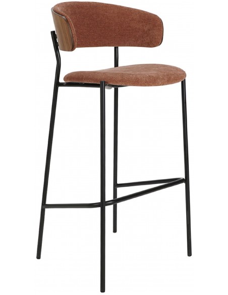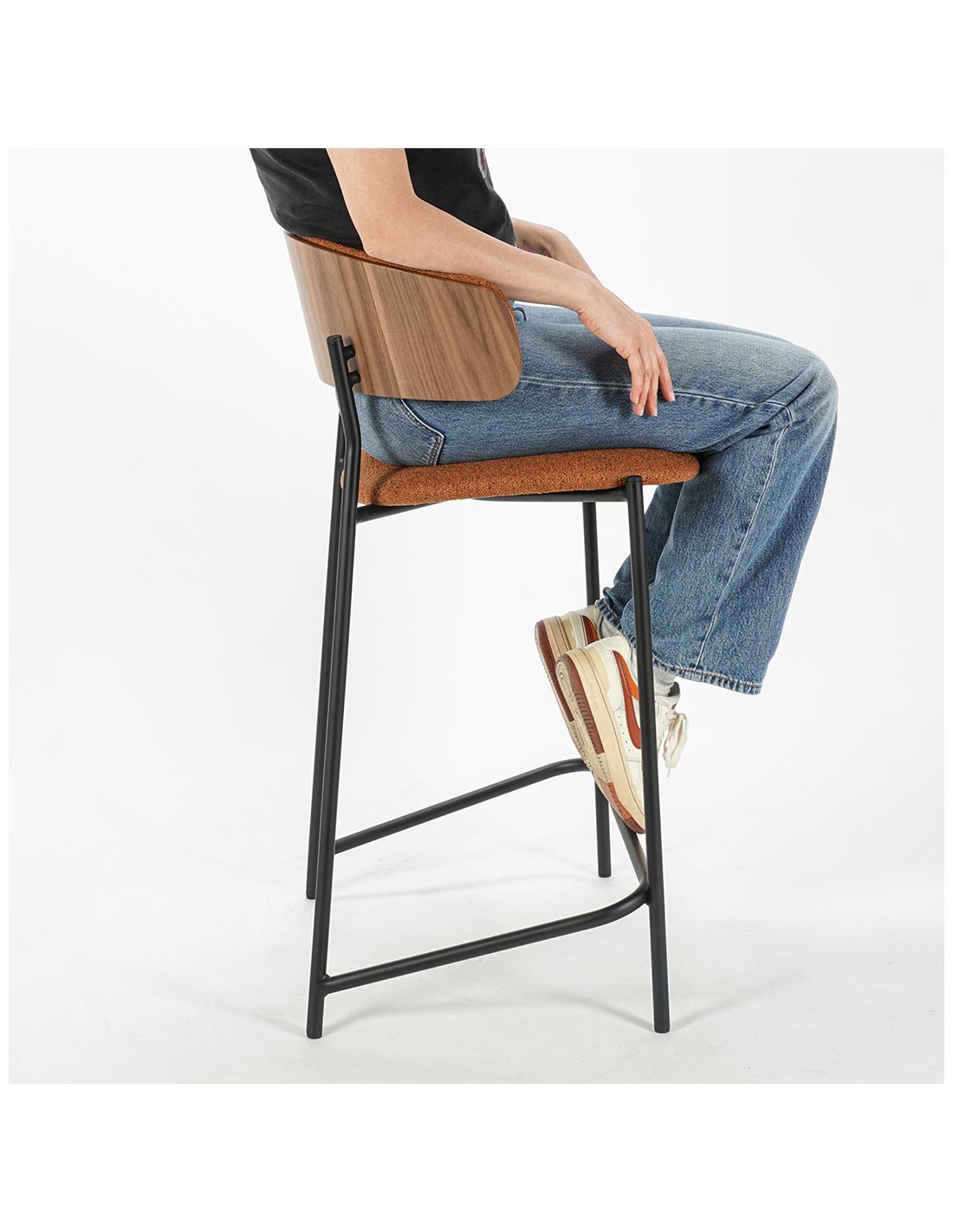 MOLLY Барный стул плавных форм и закругленных краев. Спинка повернута в сторону, поэтому закрывает большую часть спины. Каркас металлический, снизу имеются ножные шарниры, которые также будут служить подставкой для ног. Стул также имеет деревянный акцент на внешней стороне спинки.