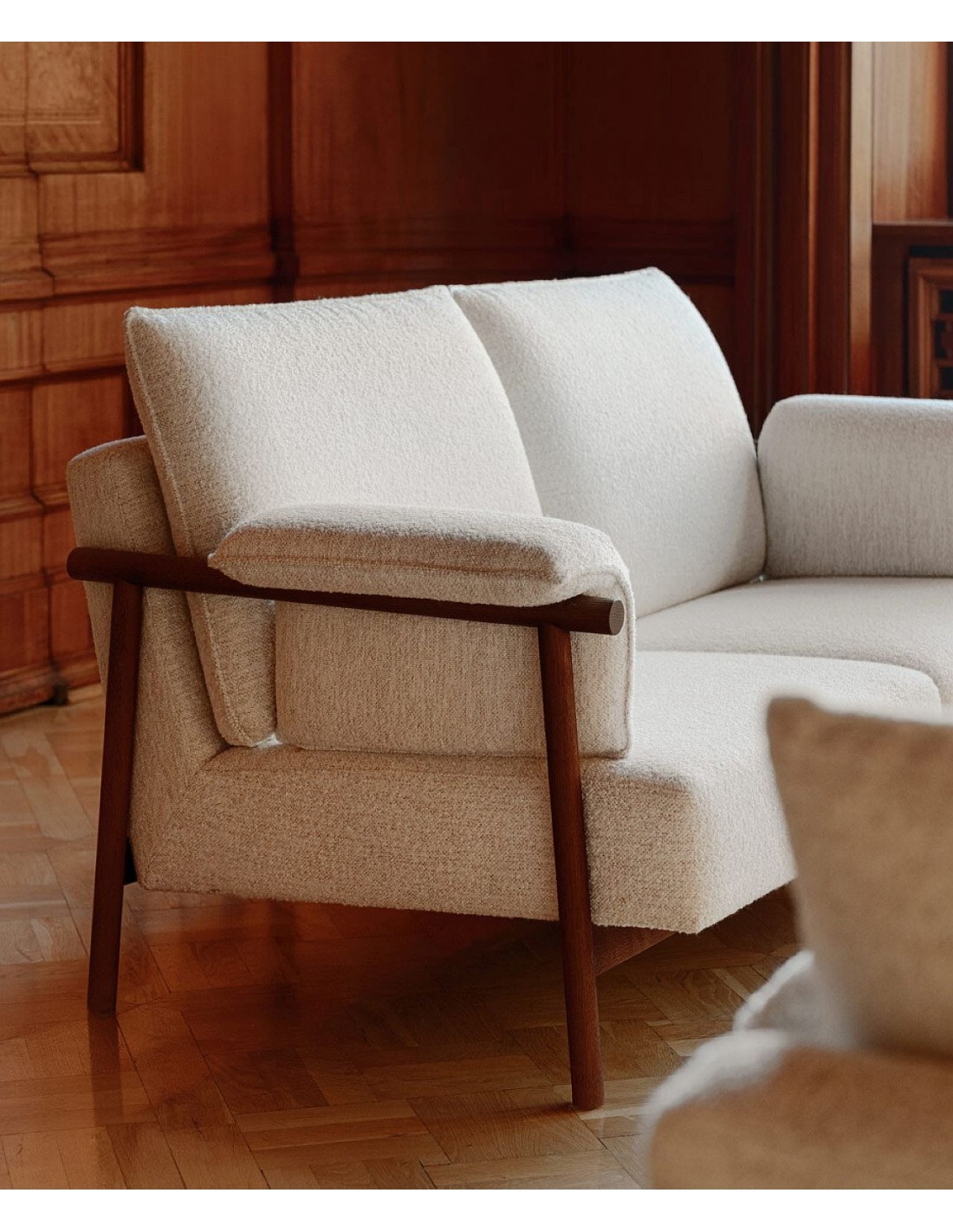 Диван TORII с обивкой из букле, мягкими подушками и деревянными деталями. Комфорт, элегантность и надежная конструкция для современного интерьера.