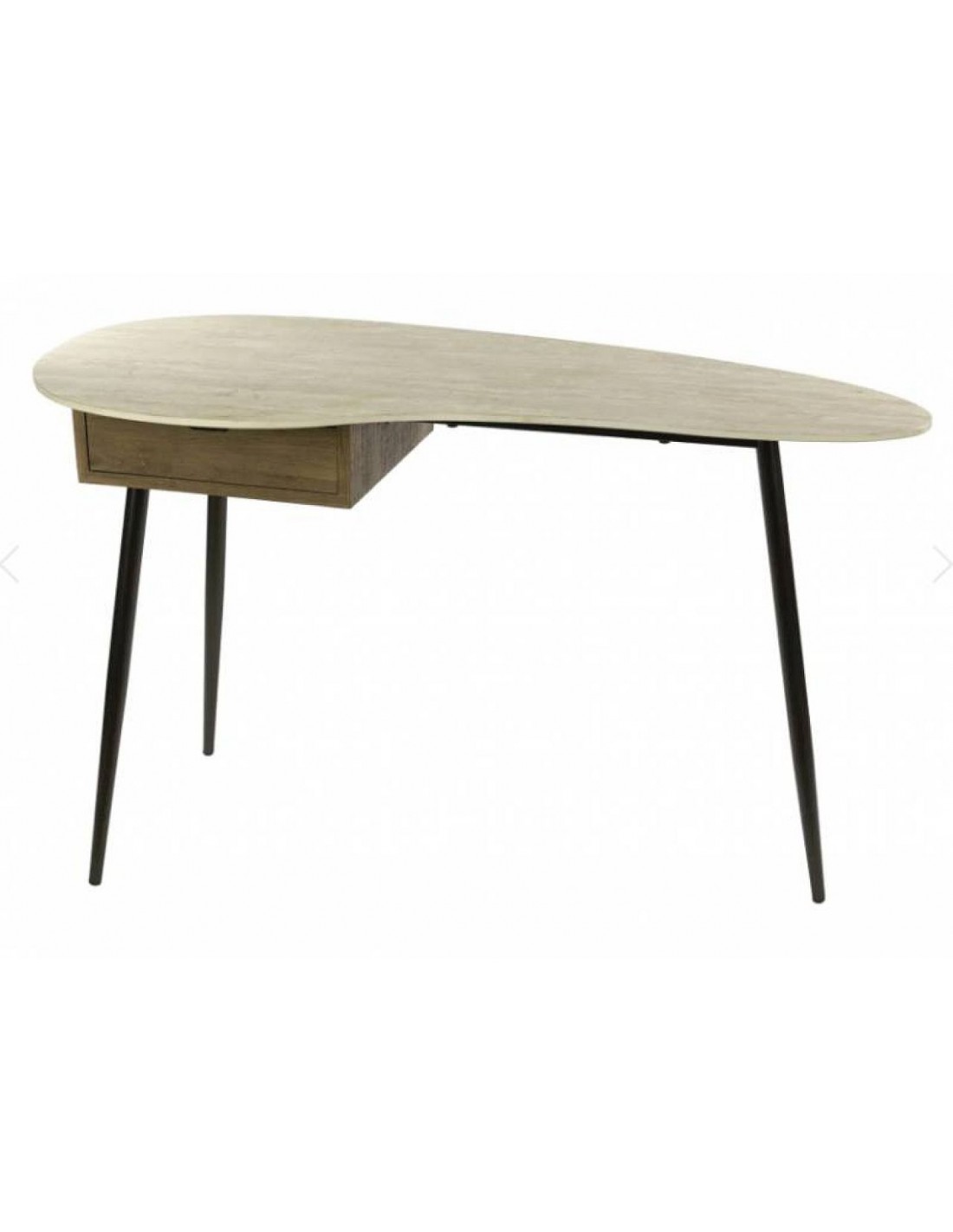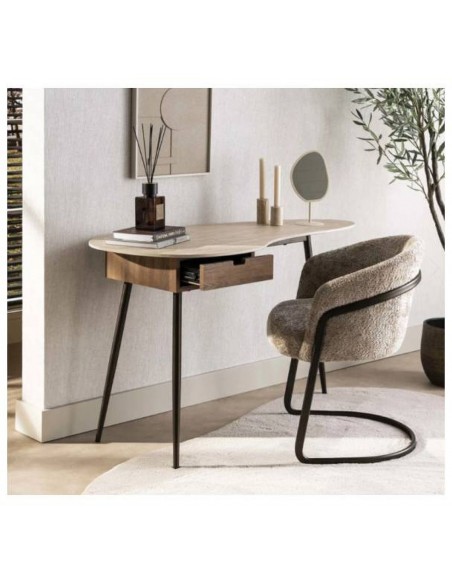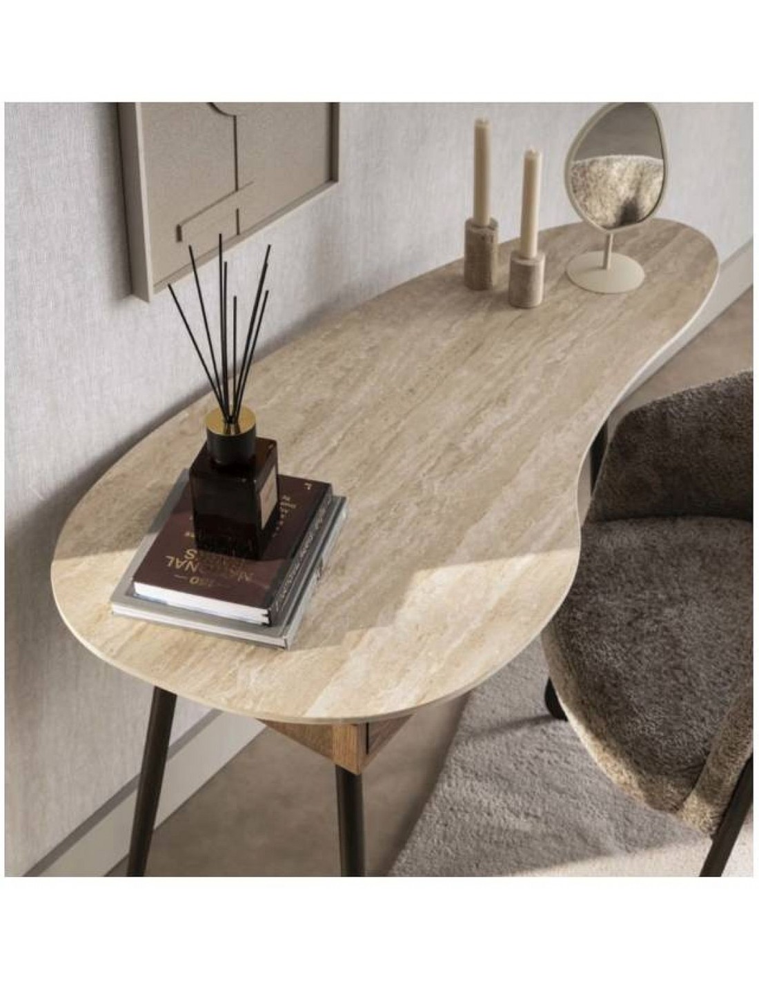 Элегантная консоль с керамической столешницей органической формы с отделкой под травертин, выдвижным ящиком и ножками из металла бронзового цвета.