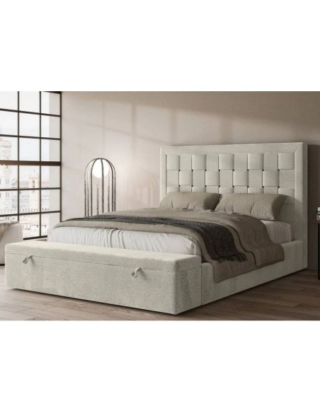 TESSA — современная кровать, выделяющаяся уникальным дизайном и функциональностью. В передней части кровати встроен удобный пуф, который не только украшает конструкцию, но и предоставляет дополнительное место для хранения. Изголовье кровати декорировано рамкой и узором в виде тканых полос, что придает ей неповторимый визуальный эффект и элегантность.