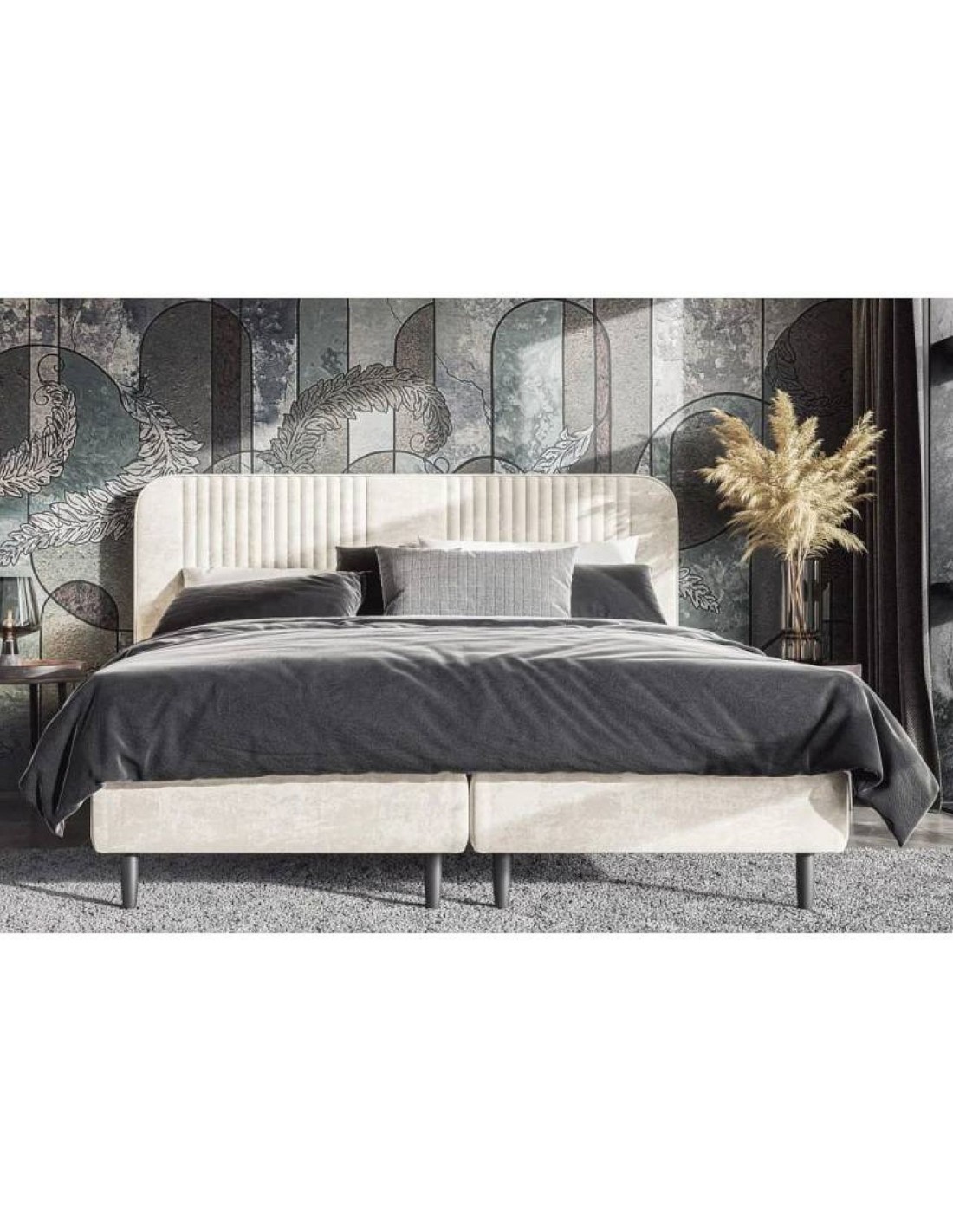 Кровать SWIFT с округлым вышитым изголовьем, прочным деревянным каркасом и металлическими ножками — современное решение для комфорта и стиля.