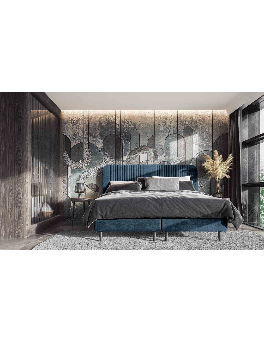 SWIFT — элегантная кровать с круглым изголовьем и вышивкой, которая добавляет современности и визуальной глубины. Прочное деревянное основание коробчатой ​​конструкции обеспечивает устойчивость и долговечность, сохраняя при этом минималистичный дизайн. Кровать без kоробки для постельного белья выглядит легче и идеально вписывается в современный интерьер.